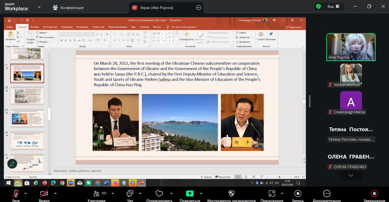 Програмою Гранту передбачено серію відкритих лекцій протягом другого семестру 2025−2026 н. р. Отже, першу лекцію «Introduction into the Eurasian Educational Space: Concepts, Approaches and Historical Context» було презентовано ректором Університету Ушинського Андрієм КРАСНОЖОНОМ, а другу лекцію «Ukraine and China: Educational Cooperation and Academic Exchanges» − деканом факультету іноземних мов Олександрою ПОПОВОЮ. До участі в ініційованій програмі міжнародної академічної мобільності було залучено понад ста учасників освітнього процесу.
