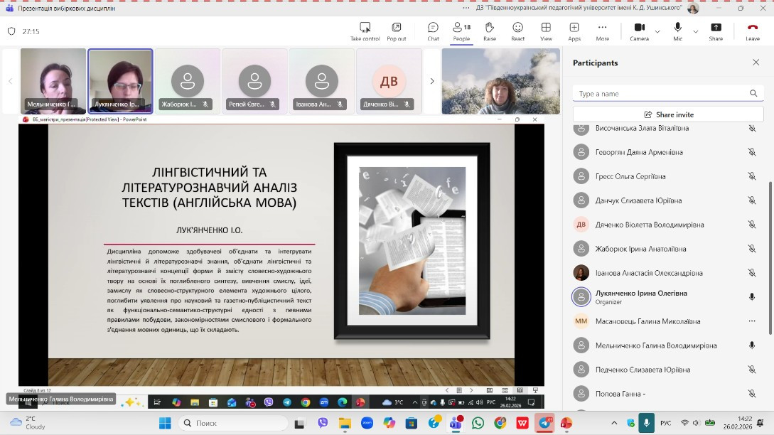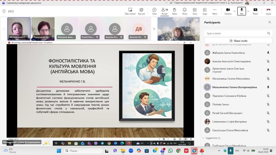 26 лютого 2026 року відбулася презентація вибіркових дисциплін для здобувачів другого (магістерського) рівня вищої освіти освітньо-професійної програми «Середня освіта (Англійська мова і зарубіжна література)» на 2026–2027 навчальний рік. Під час презентації було висвітлено мету вибіркових дисциплін, очікувані результати навчання, зміст навчальних курсів, а також ключові теми, що пропонуються для опанування. Здобувачі мали змогу ознайомитися з переліком вибіркових компонентів, поставити запитання та отримати детальну інформацію щодо особливостей їх вивчення.