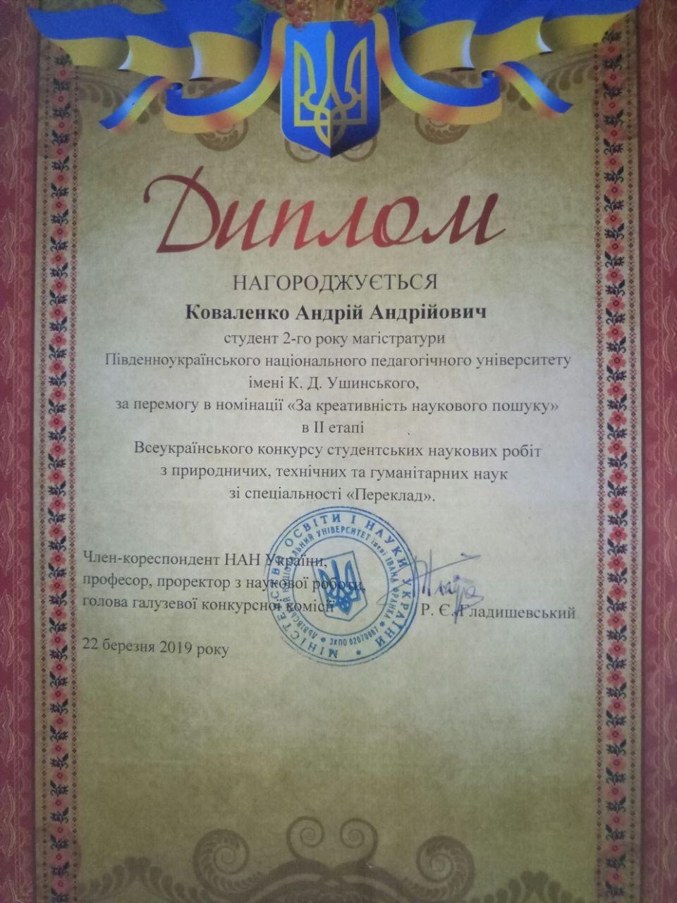 За результатами конкурсу випускник факультету іноземних мов Університету Ушинського Коваленко Андрій посів 4 місце за загальними балами та переміг у номінації «За креативність наукового пошуку».