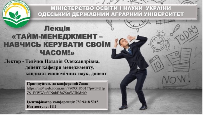 3 березня 2023 року в межах співпраці між ЗВО – партнерами на запрошення гаранта ОПП «Середня освіта (Мова і література (англійська))» другого (магістерського) рівня вищої освіти проф. Т.Є. Єременко та за сприянням доц. Н.О. Валентюк відбулася зустріч з кандидатом економічних наук, доцентом кафедри менеджменту Одеського державного аграрного університету, Н.О. Теличко, яка провела гостьову лекцію-тренінг на тему «Тайм-менеджмент – навчись керувати своїм часом».