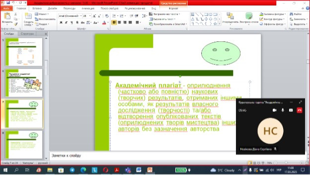 Здобувачі вищої освіти прийняли активну участь в обговоренні проблеми академічної доброчесності, виявили зацікавленість темою академічного плагіату, самоплагіату. Зокрема, особливу увагу було приділено наслідкам порушення академічної доброчесності – повторне проходження відповідного освітнього компонента освітньої програми; відрахування із закладу освіти (крім осіб, які здобувають загальну середню освіту); позбавлення академічної стипендії; позбавлення наданих закладом освіти пільг з оплати навчання.