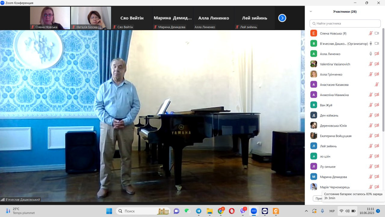 10 червня 2023 року на факультеті музичної та хореографічної освіти відбулася гостьова лекція професора Одеської національної музичної академії імені А.В. Нежданової Вячеслава Дашковського на тему «Виконавська інтерпретація творів Ф. Ліста на прикладі невідомого Концерту Es-dur op. posth. для фортепіано з оркестром». Лекцію було проведено в формі майстер-класу з ученицею 9-го класу Одеського державного музичного ліцею ім. П.С. Столярського А. Шумаковою. Під час лекції здобувачі вищої освіти отримали надзвичайно цікаву інформацію про Концерт Es-dur op. posth. для фортепіано з оркестром, який був написаний у ранній період творчості композитора і хронологічно випередив обидва відомі фортепіанні концерти Ф. Ліста. Тривалий час інформація про Концерт Es-dur op. posth. для фортепіано з оркестром Ф. Ліста була відсутня практично у всіх науково-дослідницьких джерелах про композитора. Професором В. Я. Дашковським було повідомлено, що формально саме цей концерт був Концертом № 1 і мав значний вплив на подальшу творчість Ф. Ліста, зокрема у галузі фортепіанної музики. Тому він має зайняти належне місце у творчості Ф. Ліста, передусім як зразок першого і надзвичайно вдалого досвіду в цьому жанрі, що відобразив творчі пошуки митця, у чиїй особі поєдналися піаніст-віртуоз і геніальний композитор, та перспективи розвитку жанру сольного інструментального концерту у напрямку його перетворення з циклічного твору на одночастинний. В процесі роботи над виконавською інтерпретацію твору професором В.Я. Дашковським увагу здобувачів було звернено на всі притаманні лістівському піанізму нюанси та технічні прийоми, на наявність в Концерті Es-dur op. posth. тематичного матеріалу з творів Ліста, написаних ним протягом 20-х років XIX ст. По закінченню лекції, професор кафедри музично-інструментальної підготовки Н.К. Білова від імені усіх присутніх висловила слова вдячності професорові В. Я. Дашковському за змістовну лекцію, відзначила її високий теоретико-практичний, методичний рівень, який відповідає сучасним вимогам вищої школи.