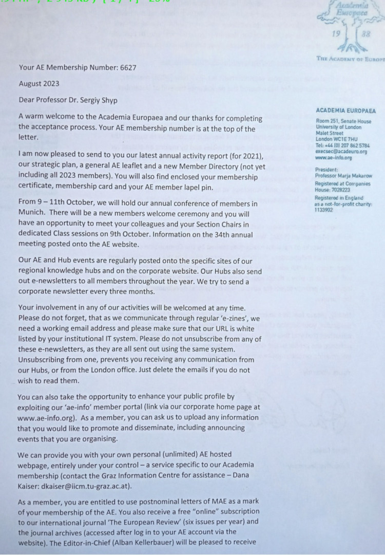 26 серпня надійшло підтвердження та всі сукупні документи щодо обрання доктора мистецтвознавства, професора, професора кафедри музичного мистецтва і хореографії ШИПА СЕРГІЯ ВАСИЛЬОВИЧА ЧЛЕНОМ ЄВРОПЕЙСЬКОЇ АКАДЕМІХ НАУК.