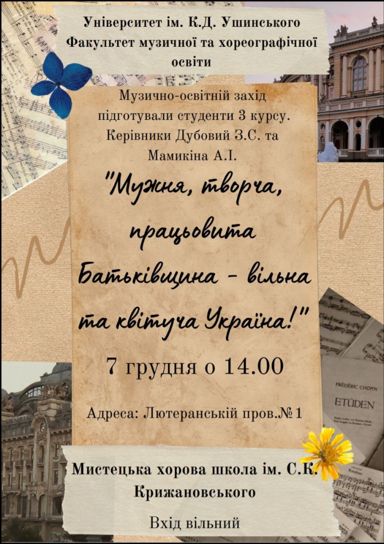 7 грудня у Мистецький хоровій школі імені С.К.Крижановського у межах Концертно-лекторської практики пройшов музично-просвітницький захід «Мужня, творча, працьовита Батьківщина – вільна та квітуча Україна», який підготували здобувачі під керівництвом кандидата педагогічних наук, викладача кафедри вокально-хорової підготовки Дубового З.С. та старшого викладача кафедри музично-інструментальної підготовки Мамикіної А.І.