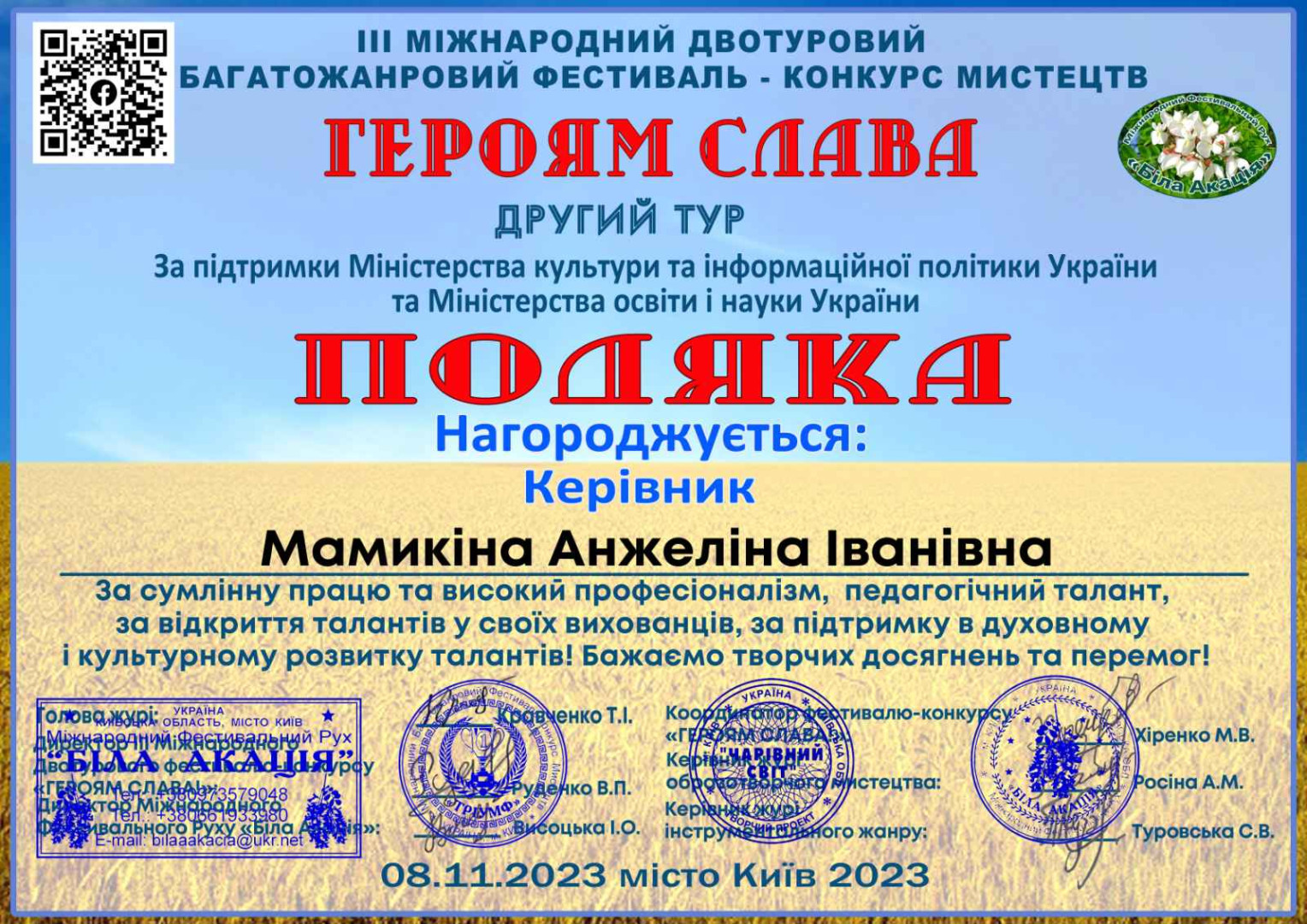 Щиро вітаємо Ніколь і Анжеліну Іванівну з перемогою! Бажаємо нових творчих успіхів і перемог! Дякуємо захисникам України, які дають нам можливість навчатися, навчати і перемагати!