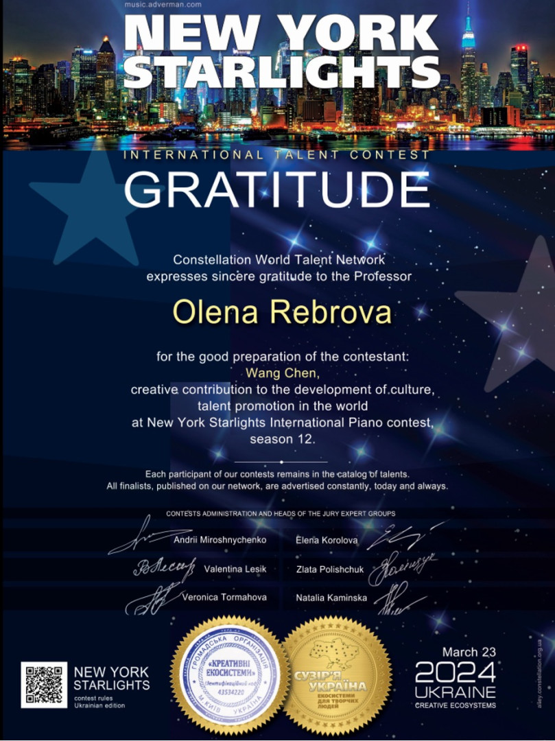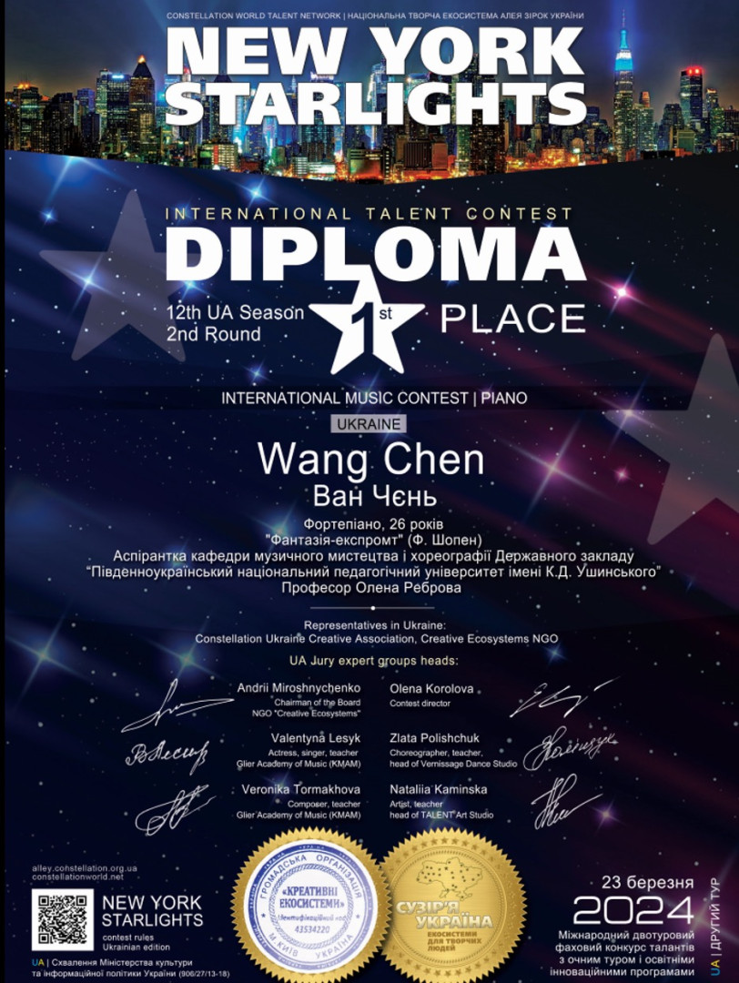 23 березня 2023 року аспіранти кафедри музичного мистецтва і хореографії Ван Чень (ОНП «Мистецька педагогіка вищої освіти») і Ван Чєнь (ОНП «Середня освіта. Музичне мистецтво») виступили на Міжнародному фестивальному проєкті-конкурсі NEW YORK STARLIGHTS, який здійснювався під патронатом творчих об’єднань: Алея Зірок України; Творча екосистема «Музика»; Творче об'єднання «Сузір'я Україна»; Constellation World Talent Network Head News Network.