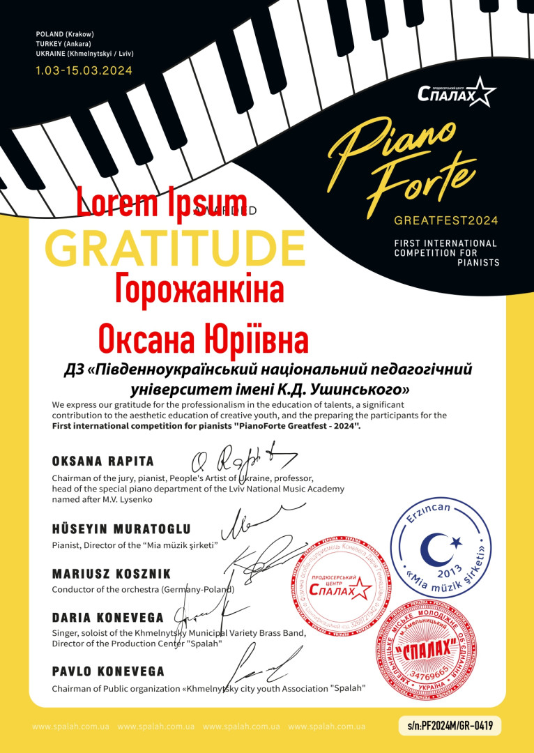 Вітаємо студента 4 курсу Юй Ціцзя з отриманням найвищої нагороди - Гран-Прі Першого міжнародного конкурсу піаністів «PianoForte Greatfest 2024».Організатором конкурсу, що охопив Україну, Литву, Латвію, Польщу, Туреччину, виступив продюсерський центр «СПАЛАХ». Міжнародне журі, яке очолювала відома українська піаністка, Народна артистка України, професорка, завідувачка кафедри спеціального фортепіано ЛНМА ім. М.В. Лисенка Оксана Михайлівна Рапіта, м. Львів, високо оцінило рівень виконавської майстерності нашого студента.