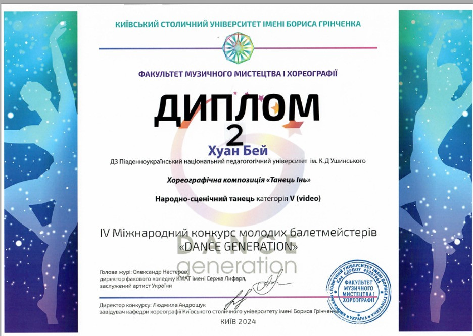 Магістранти спеціальності 024 Хореографія Лі Пейін, Хуан Бей і випускниця 2023-2024 навчального року Чжу Тяньтянь посіли призові місця на ІУ Міжнародному конкурсі молодих балетмейстерів «DANCE GENERATION», який пройшов на базі Київського столичного університету імені Бориса Грінченко.