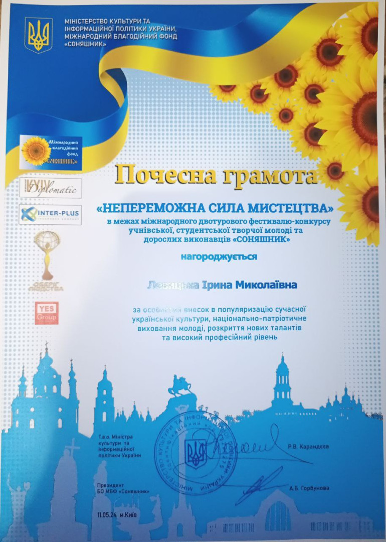 Здобувачка першого курсу спеціальності 025 Музичне мистецтво Чернокунець Марія одержала перемогу і звання лауреата І ступеню у Міжнародному фестивалі-конкурсі «Непереможна сила мистецтва», який пройшов 11 травня 2024 року в м. Київ за підтримки Міністерства культури та інформаційної політики України в рамках проекту «Соняшник». За підготовку студентки, особистий внесок у популяризацію сучасної української культури, національно-патріотичне виховання молоді, розкриття нових талантів та високий професійний рівень доцент кафедри музично-інструментальної підготовки Ірина Миколаївна Левицька була нагороджена почесною грамотою.