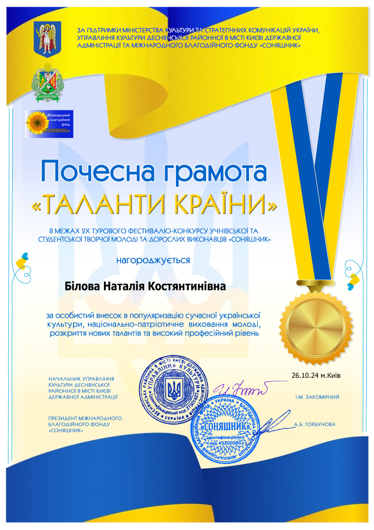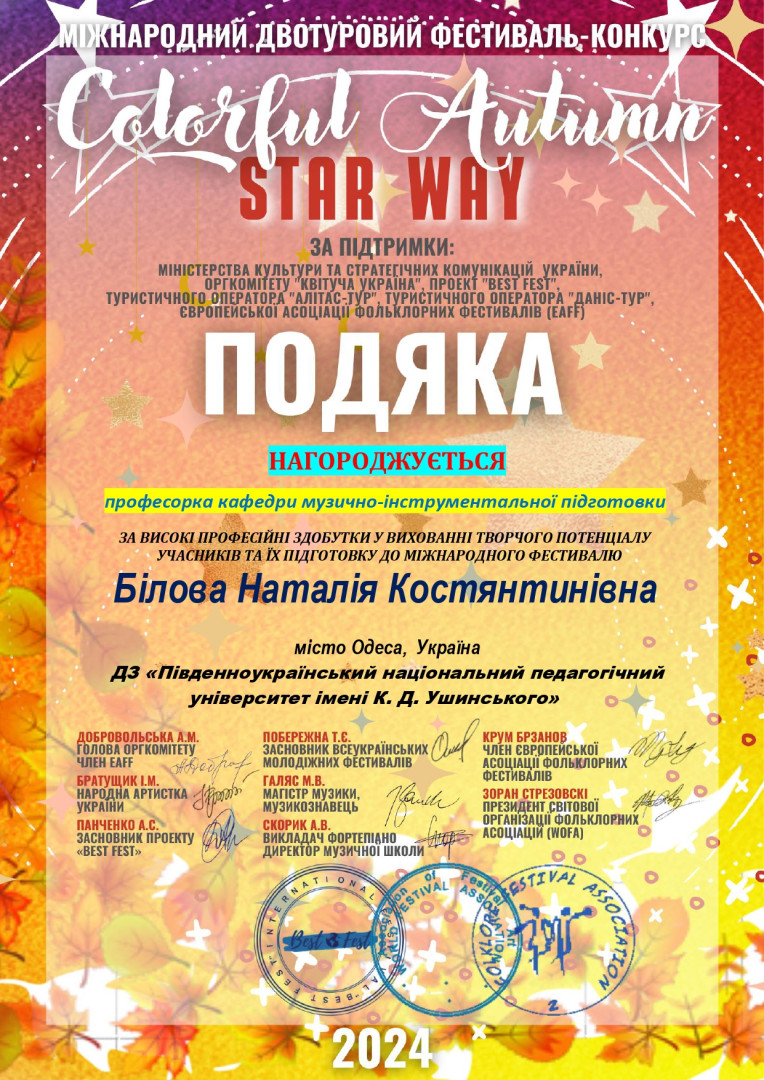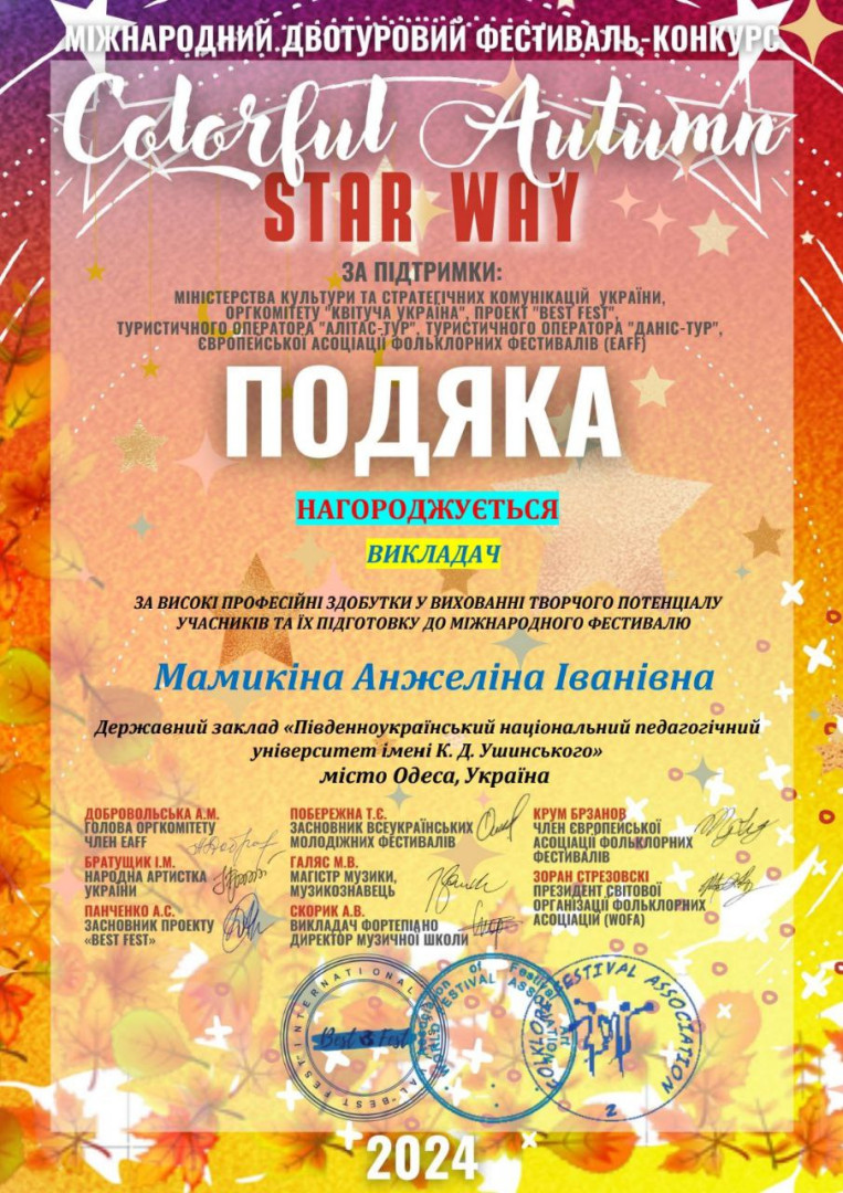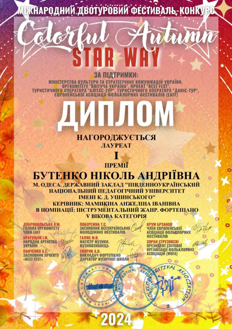Лауреатами І премії Міжнародного двотурового фестивалю-конкурсу “Colorful Autumn Star way” стали здобувачки першого (бакалаврського) рівня освіти, спеціальність 025 Музичне мистецтво Ніколь Бутенко (клас ст. викл. Мамикіної А. І.) та Чернокунець Марія (клас доцента Левицької І. М.).