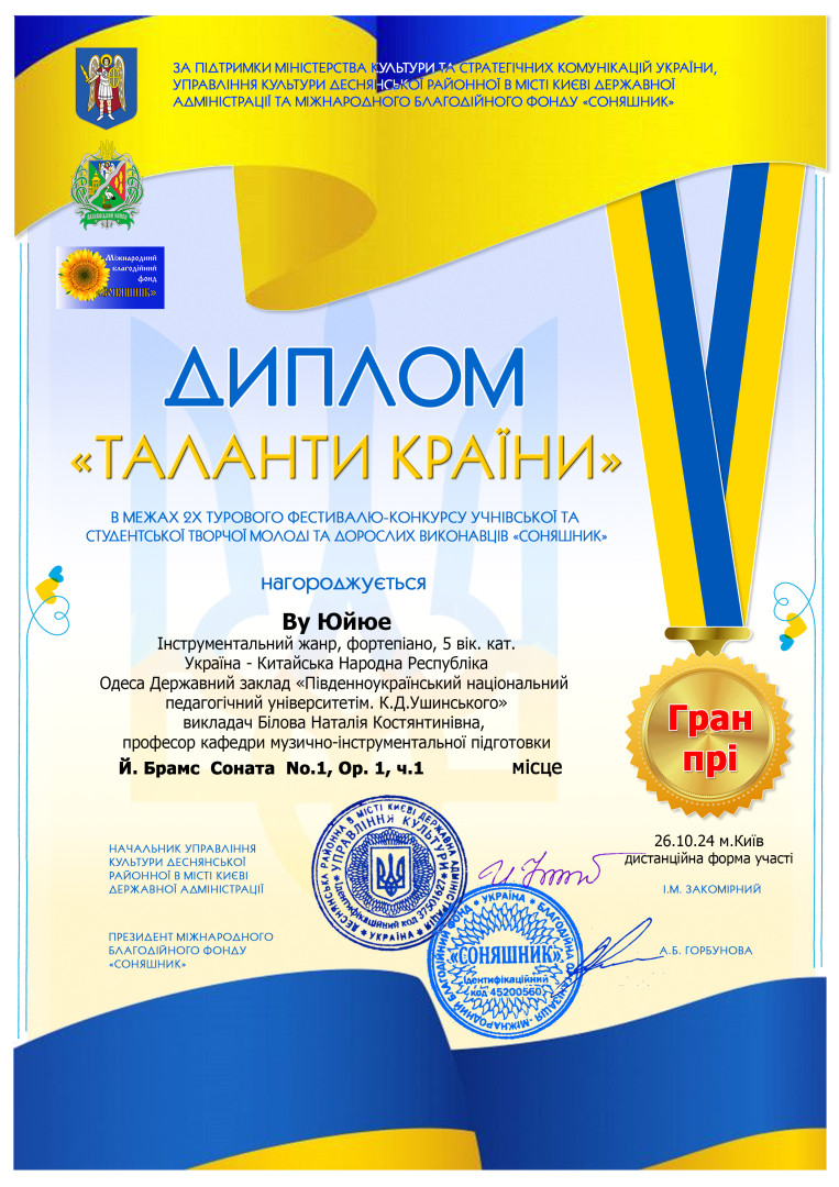 Яскраві перемоги і призові місця здобули студенти кафедри музично-інструментальної підготовки в жовтневих фестивалях-конкурсах мистецтв. Найвищі нагороди Гран-Прі одержали: Антон Колодій - здобувач першого (бакалаврського) рівня освіти, спеціальність 025 Музичне мистецтво у Міжнародному двотуровому фестивалі-конкурсі «Colorful Autumn. STAR WAY 2024» від проєкту «Квітуча Україна», який пройшов за підтримки Міністерства культури та стратегічних комунікацій України в м. Київ та Ву Юйює - здобувачка третього (освітньо-наукового) рівня освіти у Міжнародному фестивалі-конкурсі «Таланти країни» в межах двотурового фестивалю-конкурсу учнівської та студентської творчої молоді «Соняшник» за підтримки Міністерства культури та інформаційної політики України (клас професора Білової Н. К.).
