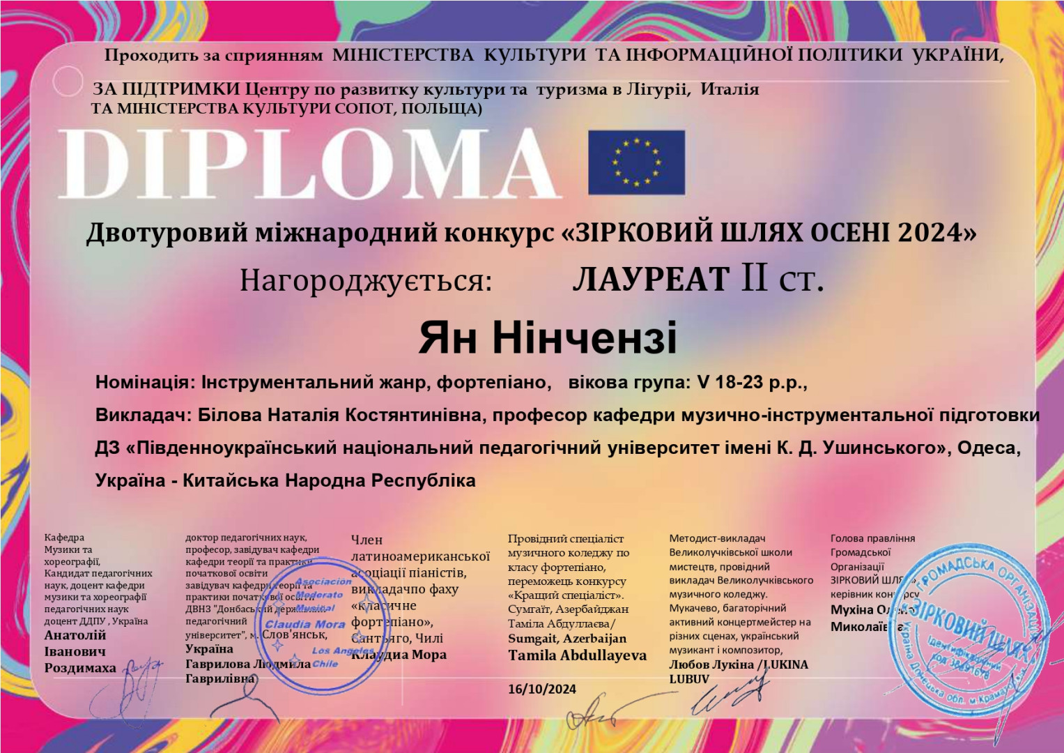 Здобувачка другого (магістерського) рівня освіти, спеціальність 025 Музичне мистецтво Ян Нінчензі стала лауреатом ІІ премії Міжнародного двотурового міжнародного конкурсу «ЗІРКОВИЙ ШЛЯХ ОСЕНІ 2024» (Україна, Італія, Польща) (клас професора Білової Н. К.).