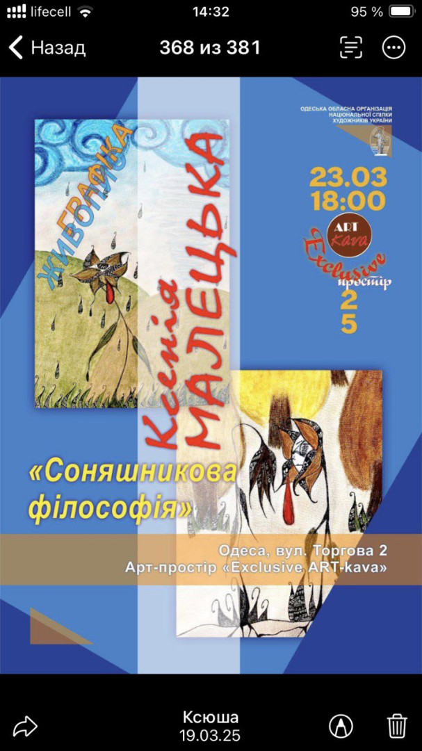 Виставка картин Ксенії Малецької – студентки факультету музичної та хореографічної освіти «Соняшникова філософія» відкрилася наприкінці березня у Арт-просторі «Exclusive ART-kava». Ця виставка, вже третя в творчому доробку Ксенії, демонструє її творчий погляд на мистецтво та глибоке розуміння людської душі. Кожен соняшник на її полотнах – це не просто квітка, а втілення людської душі, її переживань, мрій та прагнень. У своїх картинах художниця підіймає важливі теми й проблеми людського буття та способи їх вирішення. Ксенія – не лише талановита художниця, але й обдарована поетеса і авторка пісень. Її багатогранний талант вражає та надихає, демонструючи безмежні можливості творчої особистості. Пишаємося нашою талановитою студенткою і бажаємо їй невичерпного натхнення, нових яскравих ідей, подальшого розвитку таланту та успіхів у всіх творчих починаннях! Нехай кожен соняшник на її полотнах сяє все яскравіше, осяюючи світ своєю красою та мудрістю! Виставка триватиме до 6 квітня за адресою: вул. Торгова, 2.