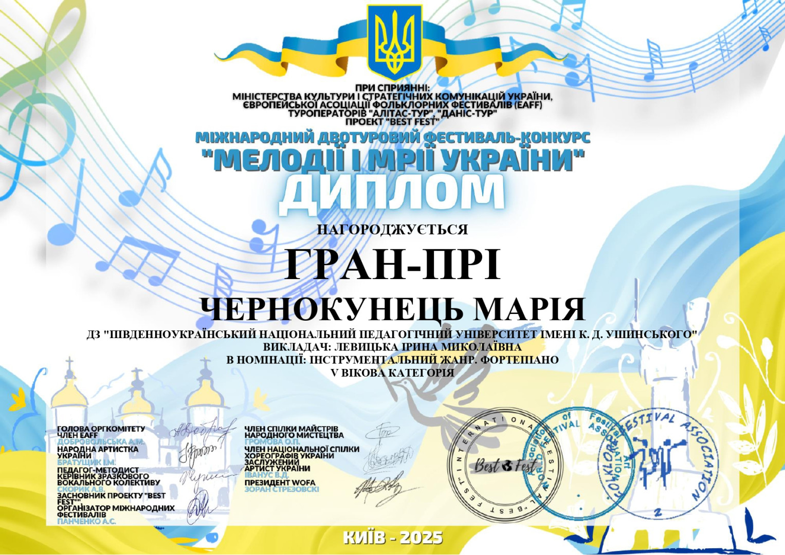 Вітаємо нашу талановиту студентку, здобувачку Навчально-наукового інституту Музичного і перформативного мистецтва та соціокультурних практик Чернокунець Марію, яка здобула найвищу нагороду – Гран-Прі на Міжнародному багатожанровому фестивалі-конкурсі «MELODIES AND DREAMS OF UKRAINE 2025». Фестиваль-конкурс, організований проєктом «Квітуча Україна», відбувся у Києві за підтримки Міністерства культури та стратегічних комунікацій України, а також Європейської асоціації фольклорних фестивалів (EAFF), що підкреслює його високий статус і міжнародне визнання. Пишаємося перемогою Марії та її наставниці, доцента Ірини ЛЕВИЦЬКОЇ! Від щирого серця бажаємо невичерпної енергії, творчого натхнення та підкорення найвищих музичних вершин.