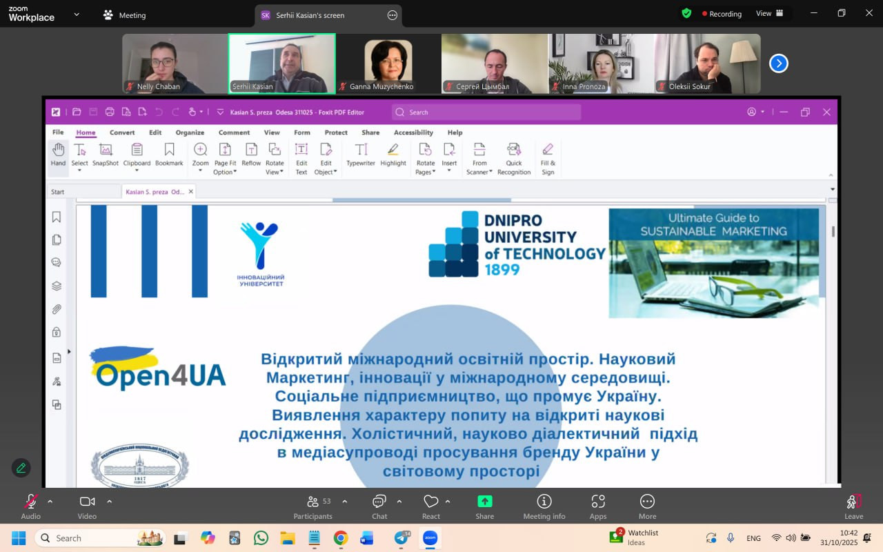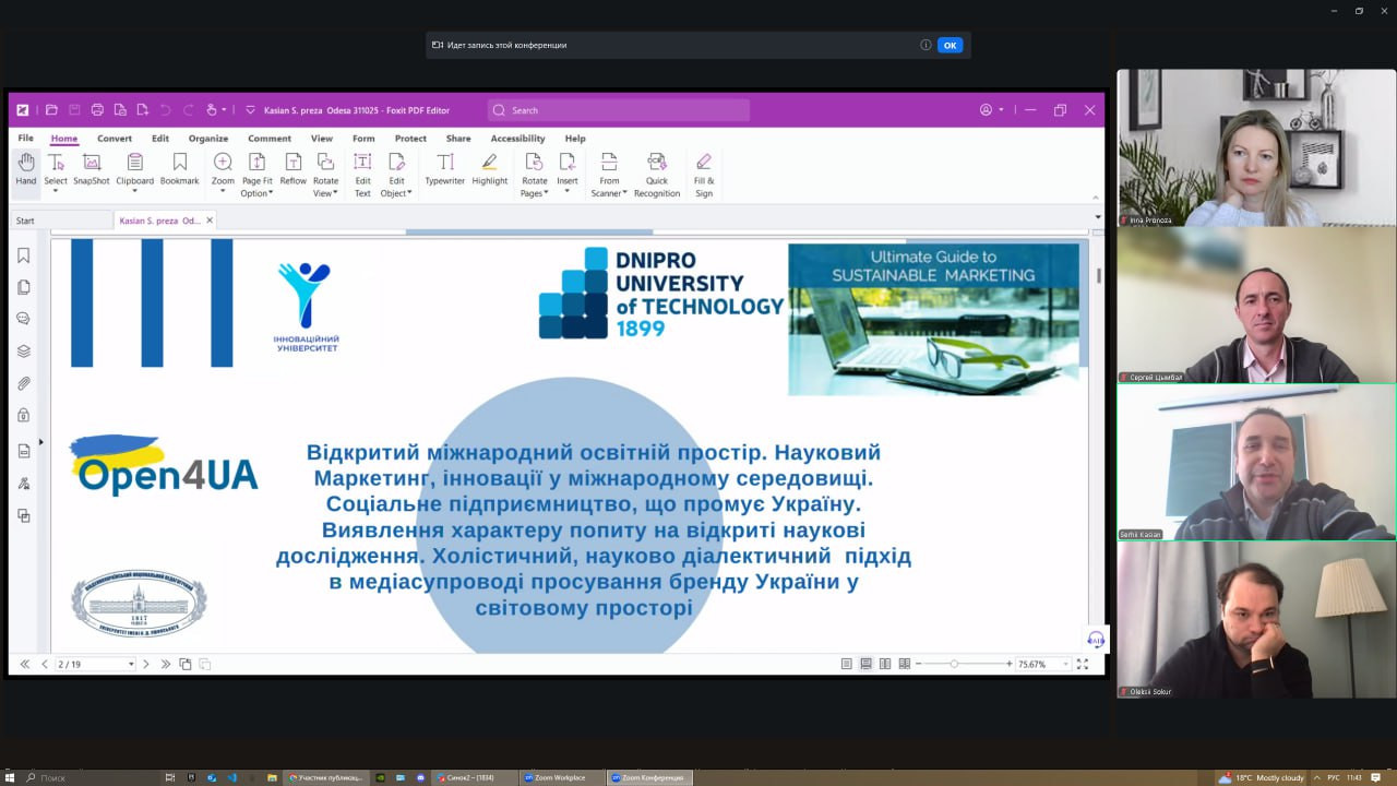31 жовтня 2025 року здобувачі ОПП «Менеджмент соціокультурної діяльності», ОНП «Філософія бізнесу та соціокультурних практик», ОНП «Філософія» на запрошення дружньої кафедри політичних наук і права долучилися до гостьової лекції на тему «Формування й просування на міжнародних ринках бренду України». Запрошеним спікером став Сергій КАСЬЯН – кандидат економічних наук, доцент, професор кафедри маркетингу НТУ «Дніпровська політехніка», заступник голови Офісу підтримки вченого при МОН України. Лекція викликала жвавий інтерес серед слухачів, адже торкалася питань, що безпосередньо стосуються сучасної ролі культури, освіти та філософії у розбудові національного іміджу. У ході зустрічі обговорювалися: