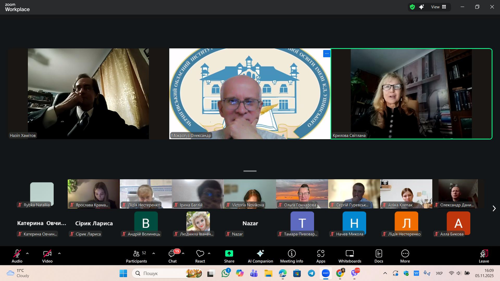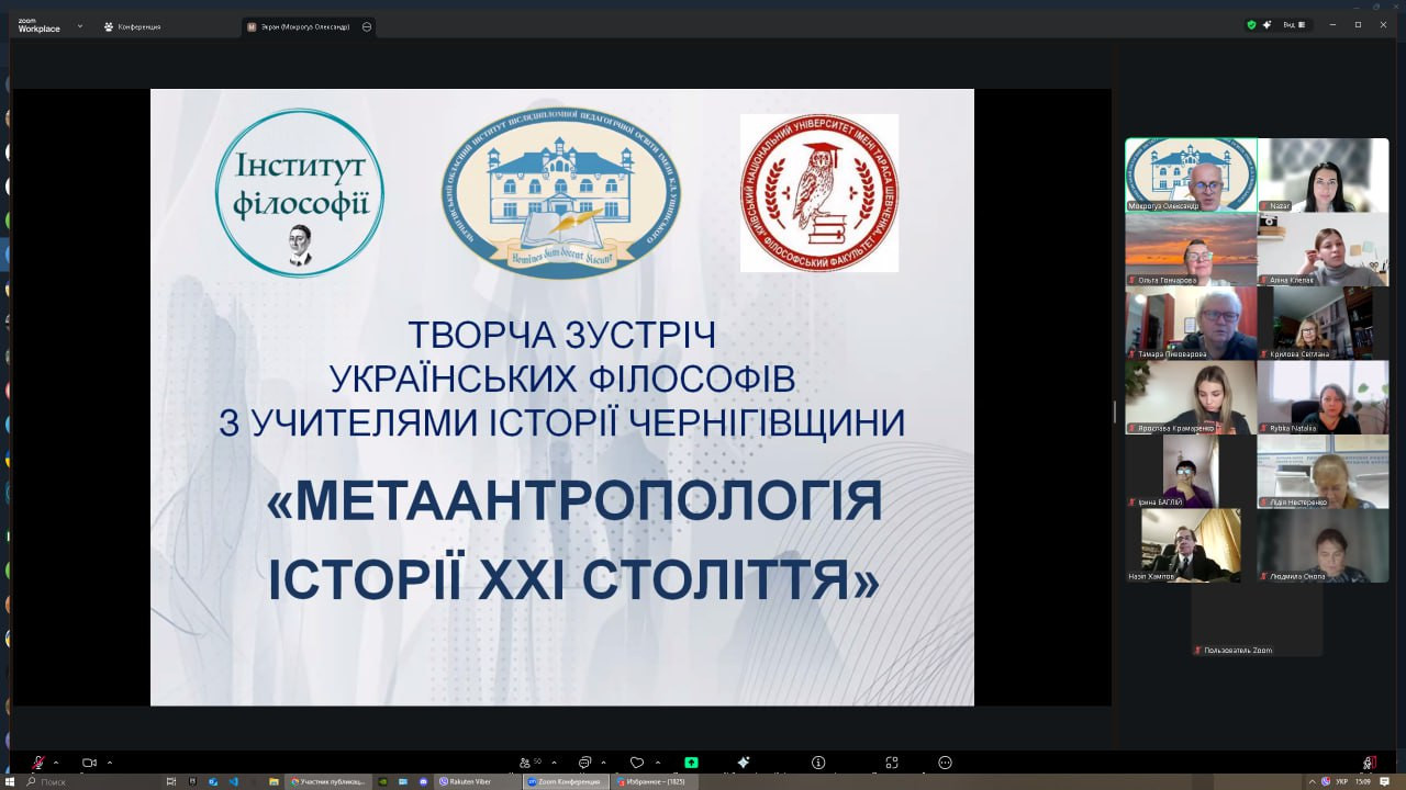 5 листопада 2025 року здобувачі третього (освітньо-наукового) рівня вищої освіти ОНП «Філософія» та ОНП «Філософія бізнесу та соціокультурних практик» разом із Гарантом програми проф. Петіновою О.Б. взяли участь у творчій зустрічі українських філософів з учителями історії Чернігівщини «Метаантропологія історії XXI століття». Цей захід став важливою платформою для обговорення сучасних підходів до філософії історії та розвитку гуманістичних цінностей у освітньому процесі. Особливу увагу було приділено актуальності компетентностей, необхідних сучасному викладачу та досліднику: критичне мислення, міждисциплінарний підхід, творче осмислення історичних процесів. Аспіранти мали змогу на практиці долучитися до обговорення важливих освітньо-наукових ідей. У заході взяли участь Ігор Усатюк, Людмила Городнюк, Микола Начев, а також докторантка Наталія Рибка.