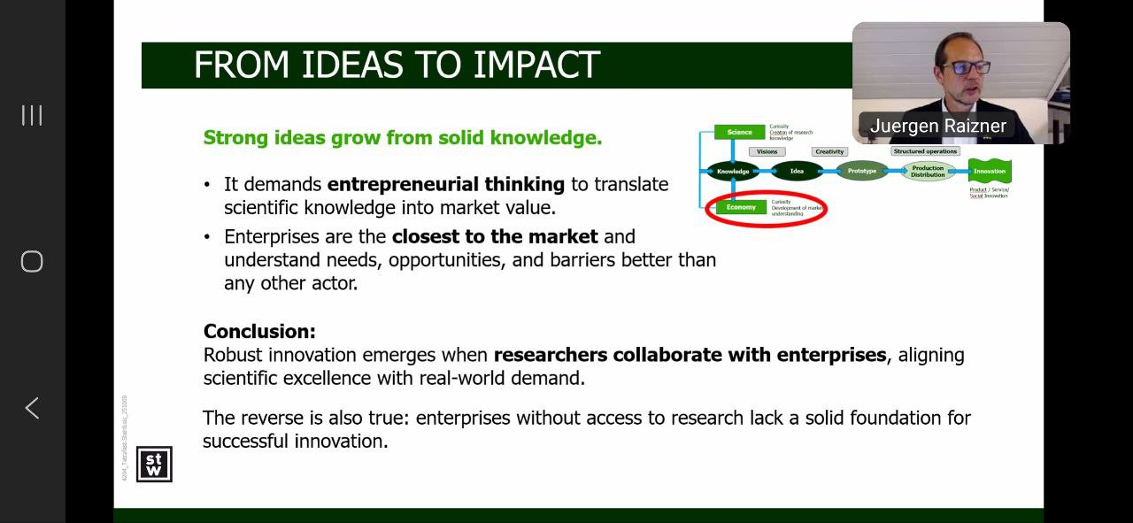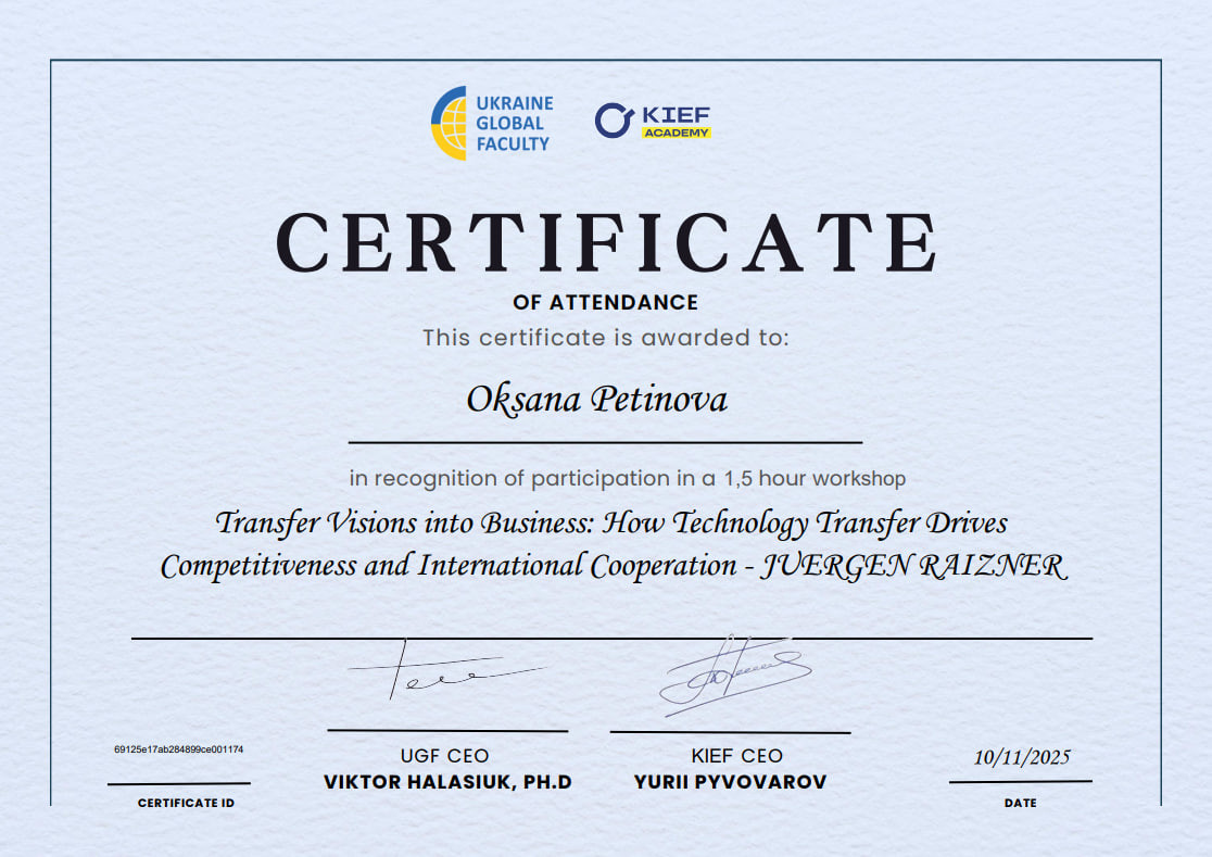 В межах ОК «Філософія бізнесу та соціокультурних практик» здобувачі другого (магістерського) рівня вищої освіти ОНП «Філософія бізнесу та соціокультурних практик», а також першого (бакалаврського) рівня вищої освіти ОПП «Менеджмент соціокультурної діяльності» 4 року навчання (викладач – проф. Петінова О. Б.) відвідали онлайн-семінар директора Steinbeis Enterprises, експерта із трансферу технологій та міжнародної співпраці Юргена Райцнера на тему «Трансформація ідей у бізнес: як трансфер технологій сприяє конкурентоспроможності та міжнародній співпраці», що проходив на міжнародній освітній платформі Ukraine Global Faculty 10 листопада 2025 року. У контексті філософії бізнесу та соціокультурних практик зустріч акцентувала увагу на тому, що технологічні інновації – це не лише економічний інструмент, а й ціннісний процес, який формує культуру взаємодії між наукою, підприємництвом і суспільством. Такий підхід поєднує етику, креативність і соціальну відповідальність бізнесу, створюючи підґрунтя для сталого розвитку. У філософії бізнесу трансфер технологій розглядається не лише як економічний процес, а як ціннісна взаємодія, що формує нову культуру інновацій і відповідального підприємництва. Аналізували кращі європейські практики, а також можливості для України: як впровадження технологічного трансферу може стати соціокультурною практикою відновлення, поєднуючи економічне зростання з розвитком людського потенціалу та інноваційного мислення. В обговоренні проблематики взяли активну участь Павло Козленко та Анастасія Даниленко. Такі зустрічі з міжнародними експертами-практиками мають важливе значення для здобувачів освіти, адже сприяють поєднанню теоретичних знань із реальним досвідом сучасного бізнесу, науки та міжнародного партнерства. Вони формують у студентів критичне мислення, навички міждисциплінарного аналізу та розуміння глобальних тенденцій розвитку інновацій. Спілкування з практиками допомагає усвідомити роль філософії, етики та соціальної відповідальності у бізнесових процесах, розвиває компетентності лідерства, комунікації та креативності, необхідні для участі у трансформаційних процесах сучасного суспільства. Подібні заходи сприяють інтеграції академічного середовища у міжнародний простір інновацій та сталого розвитку.