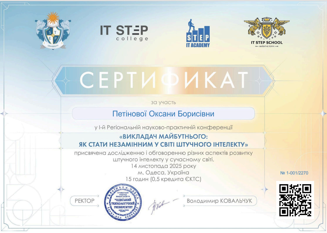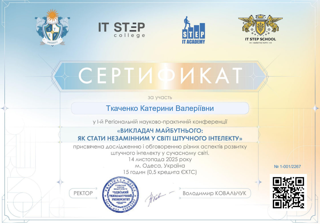 14 листопада 2025 року в ПЗВО «Одеський технологічний університет ШАГ» відбулася І-а Регіональна науково-практична конференція «Викладач майбутнього: як стати незамінним у світі штучного інтелекту», що об’єднала викладачів, науковців, аспірантів, студентів та фахівців IT-галузі з різних регіонів України. Подія пройшла у змішаному форматі, забезпечивши максимально широкий доступ до сучасних знань та обміну професійним досвідом. Наші викладачі активно долучилися до роботи конференції та взяли участь у професійних дискусіях. Захід став майданчиком для натхнення та професійного зростання завдяки виступам запрошених експертів: