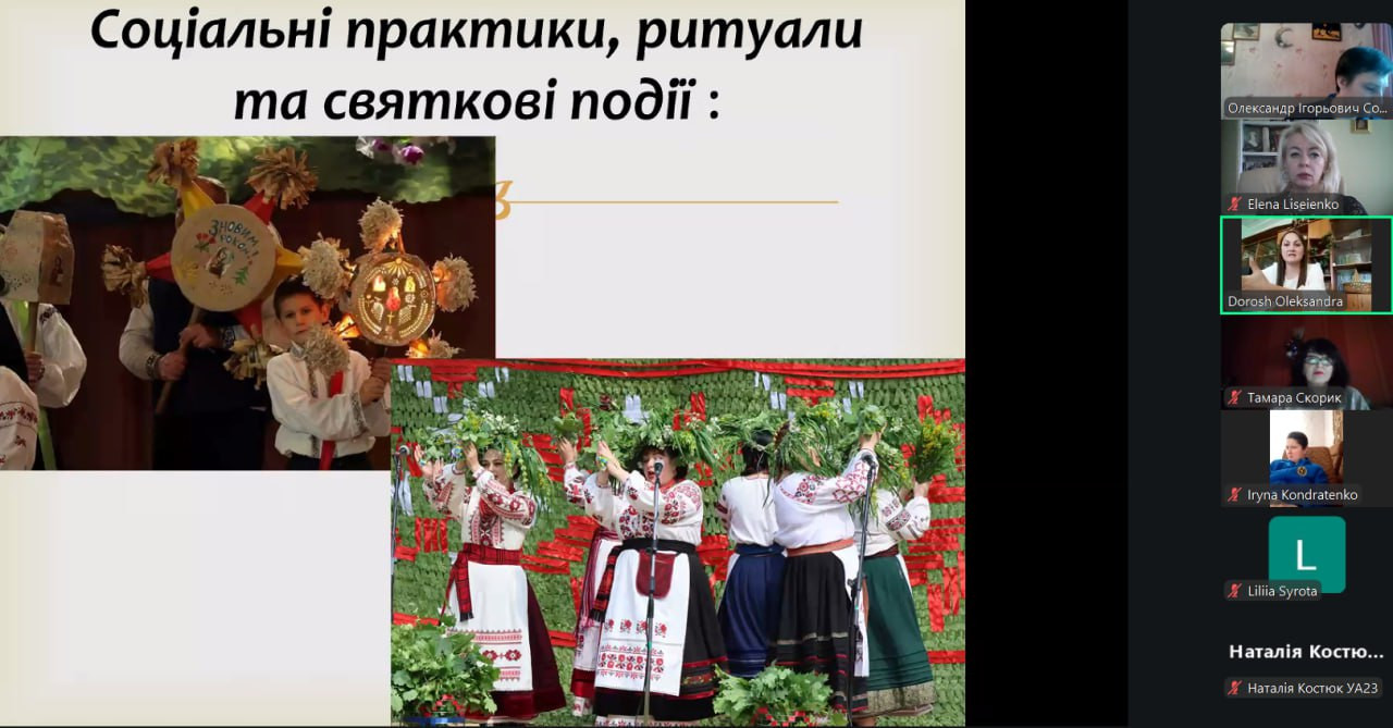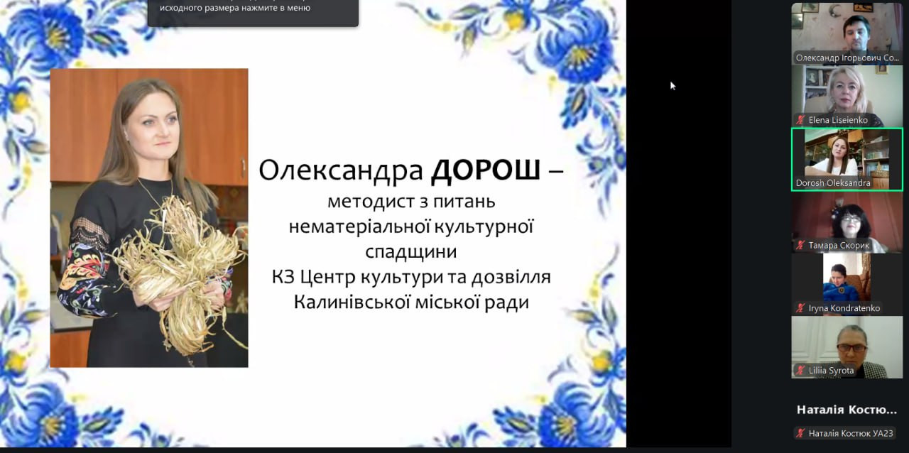 Спікеркою виступила фахівець-практик з галузі культури і мистецтва Дорош Олександра, методист з питань нематеріальної культурної спадщини Комунального закладу «Центр культури та дозвілля» Калинівської міської ради (Вінницька область). Її виступ був цікавим і насиченим реальними кейсами щодо збереження та розвитку нематеріальної культурної спадщини в Калинівській міській ради. Олександра Дорош продемонструвала, як плідна робота з нематеріальною спадщиною формує локальну ідентичність і згуртовує територіальну громаду.