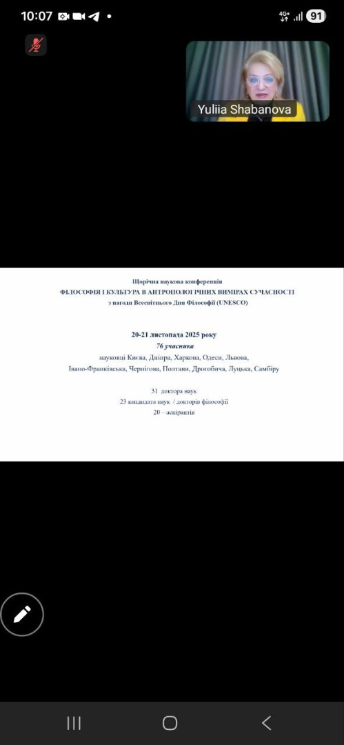 20–21 листопада 2025 року відбулася щорічна наукова конференція «Філософія і культура в антропологічних вимірах сучасності», приурочена до Всесвітнього Дня філософії (UNESCO). Модераторка заходу – проф. Юлія Шабанова, директорка НДЦ «Інститут світової культури», КЗВО «Дніпровська академія музики ДОР» (ЗВО-партнер). Захід об’єднав науковців та здобувачів освіти із різних ЗВО та наукових інституцій. Конференція стала важливою платформою для міждисциплінарного діалогу, обміну науковими ідеями та осмислення актуальних викликів сучасності крізь призму філософії та культури. У межах конференції виступили відомі науковці, які виступили з доповідями, що торкалися актуальних питань філософської антропології, етичних запитів сучасної філософії, соціального виміру людського буття в часі війни та інших.