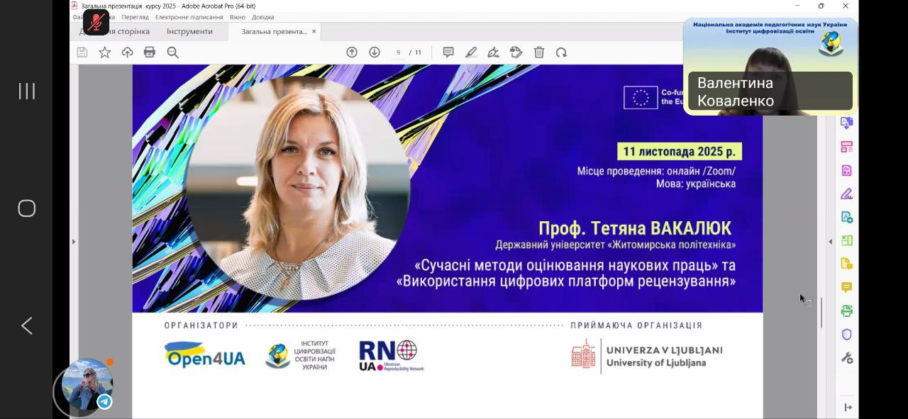 Успішно завершилося проходження міжнародного підвищення кваліфікації за програмою академічної мобільності «Рецензування в епоху відкритої та відтворюваної науки: нові виклики та можливості», яке тривало з 10 листопада по 10 грудня 2025 року у дистанційному форматі, в якому взяла участь проф. Оксана Петінова. Навчальний курс було реалізовано Консорціумом проєкту Open4UA, Інститутом цифровізації освіти НАПН України, Ukrainian Reproducibility Network (UARN) у співпраці з University of Ljubljana (Словенія).