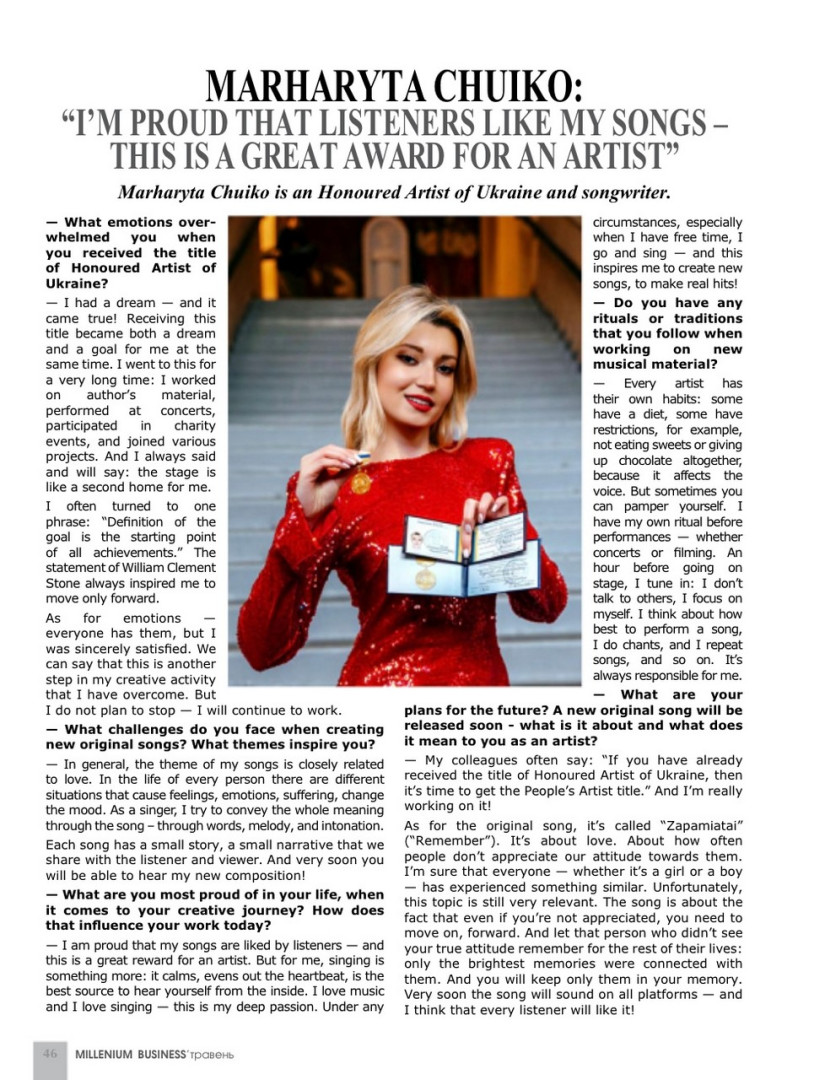 Маргарита каже: «Пишаюся тим, що мої пісні подобаються слухачам – велика нагорода для артиста». А ми пишаємося тим, що така талановита дівчина навчалася в нашому Університеті Ушинського, вона стала справжнім амбасадором нашої української пісні, її автором, виконавцем. Вона співає не лише в Україні, а й за її межами. Дає інтерв’ю відомим зарубіжним журналам: «OPIUM», «MILLENIUM BUSINESS» та ін. Її найкращі пісні-композиції «Запам’ятай», «Пожежа» - стали творчою візитівкою «Посла культурної дипломатії».
