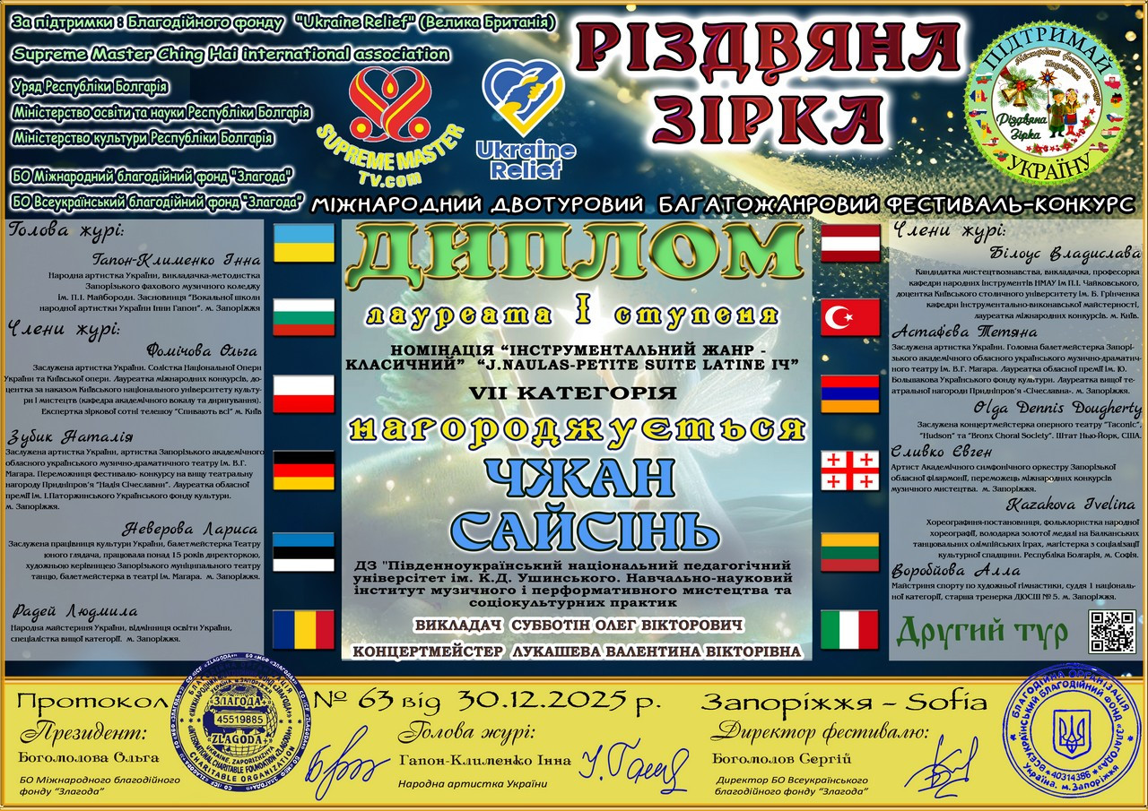 Чжан Сайсінь – Лауреат 1 ступеня – Двотуровий міжнародний багатожанровий фестиваль-конкурс «Різдвяна Зірка» м.Запоріжжя. Другий тур було проведено 29.12.2025 року. Результати отримані вже після свят у 2026 році. ! Конкурс проводиться за підтримки : Уряду Республики Болгарія; Міністерства освіти та науки Республіки; Болгарія, Міністерства культури Республики Болгарія; Благодійного фонду "Ukraine Relief" (Велика Британія); Supreme Vaster Ching Hal International association. Викладач нашого переможця – Олег Вікторович Субботін
