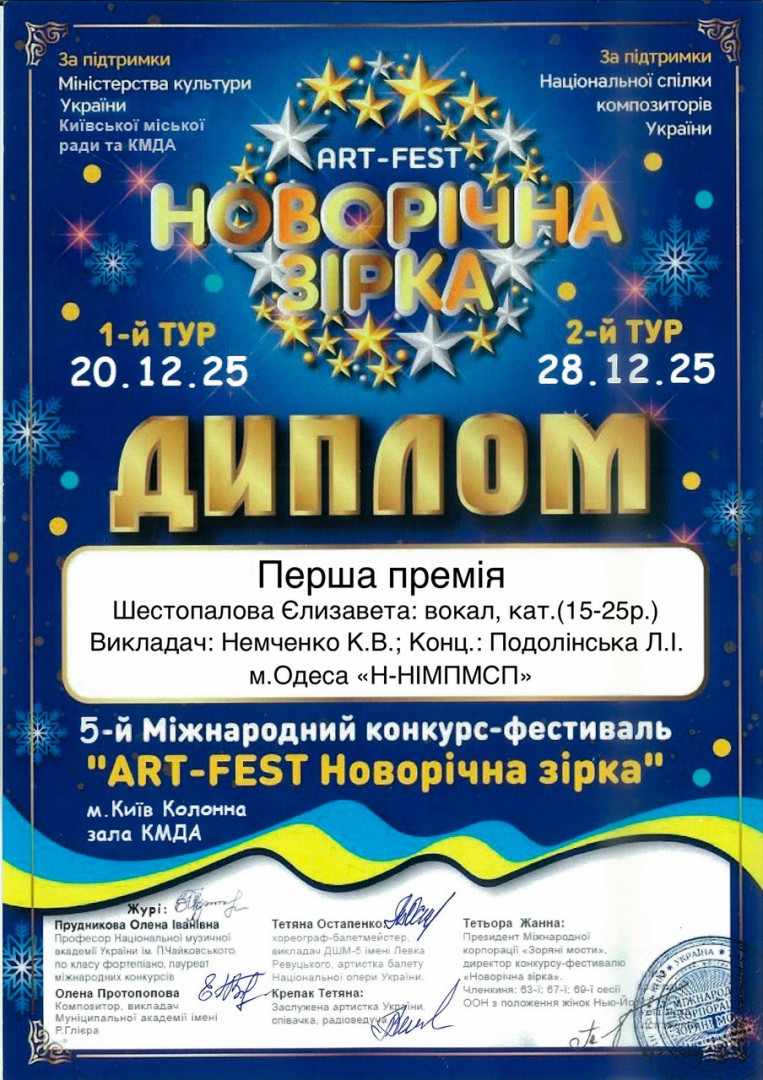Шестопалова Єлізавета – Перша Премія – 5 Міжнародний конкурс-фестиваль ART-FEST «Новорічна зірка». Конкурс – двотуровий; 28.12.2025 було проведено другий тур, результати були отримані вже у 2026 році!. Конкурс проводиться під патронатом Міністерства культури України та Національної спілки композиторів України. Подяку отримали викладач Катерина Вікторівна Немченко і концертмейстер Людмила Іванівна Подолінська.