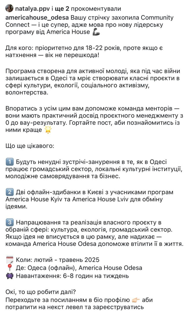 Наша викладачка к. філос. н. Катерина Ткаченко долучилася до лідерської програми Community Connect, що реалізується America House Odesa. Вона виступатиме менторкою у категорії «Культура», супроводжуючи учасників у розробці та впровадженні соціокультурних, творчих, освітніх і громадських ініціатив. Community Connect – це практикоорієнтована програма для активної молоді, спрямована на формування лідерських компетентностей, навичок проєктного менеджменту та міжсекторальної взаємодії. Програма поєднує серію тематичних зустрічей, роботу з досвідченими менторами, а також створення власних проєктів у сферах культури, роботи громадських секторів. екології, громадського активізму та волонтерства. Участь Катерини Ткаченко як менторки є важливим кроком для нашої кафедри, адже вона безпосередньо інтегрує академічну експертизу університету в актуальні міські та міжнародні освітньо-культурні процеси. Її досвід у менеджменті соціокультурної діяльності, науковій та креативній роботі дозволяє поєднати теоретичні підходи з практичними інструментами реалізації проєктів. Особливо значущим є те, що до програми залучаються студенти ОПП «Менеджмент соціокультурної діяльності» та магістранти ОНП «Філософія бізнесу та соціокультурних практик». Для них участь у Community Connect стає можливістю застосувати знання, здобуті під час навчання, у реальних проєктах; набути досвіду командної роботи та взаємодії з громадським сектором; розширити професійні контакти й сформувати власні ініціативи, актуальні для Одеси та України.