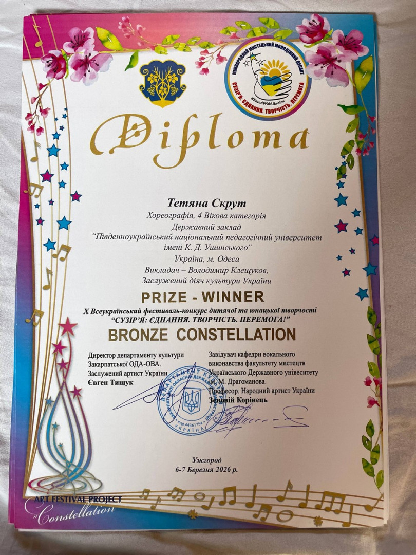 Вітаємо наших студентів, музикантів і хореографів з чудовими, переможними виступами на Х Двотуровому Всеукраїнському фестивалі-конкурсі «Сузір’я: Єднання. Творчість. Перемога» #StandWithUkraine. Разом сильніше»! Метою конкурсу є об’єднання молоді навколо ідеї миру, культурного надбання, традицій і творчості; подальша підтримка та розвиток дитячої та молодіжної творчості в мінливих умовах сьогодення, поєднання міжнародної молодіжної спільноти навколо України.