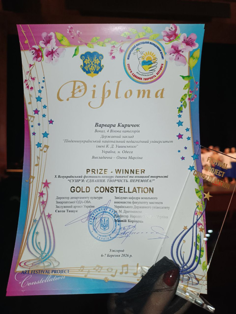 Варвара Киричок – Gold Constellation, номінація естрадний вокал, викладач Олена Маргіна;