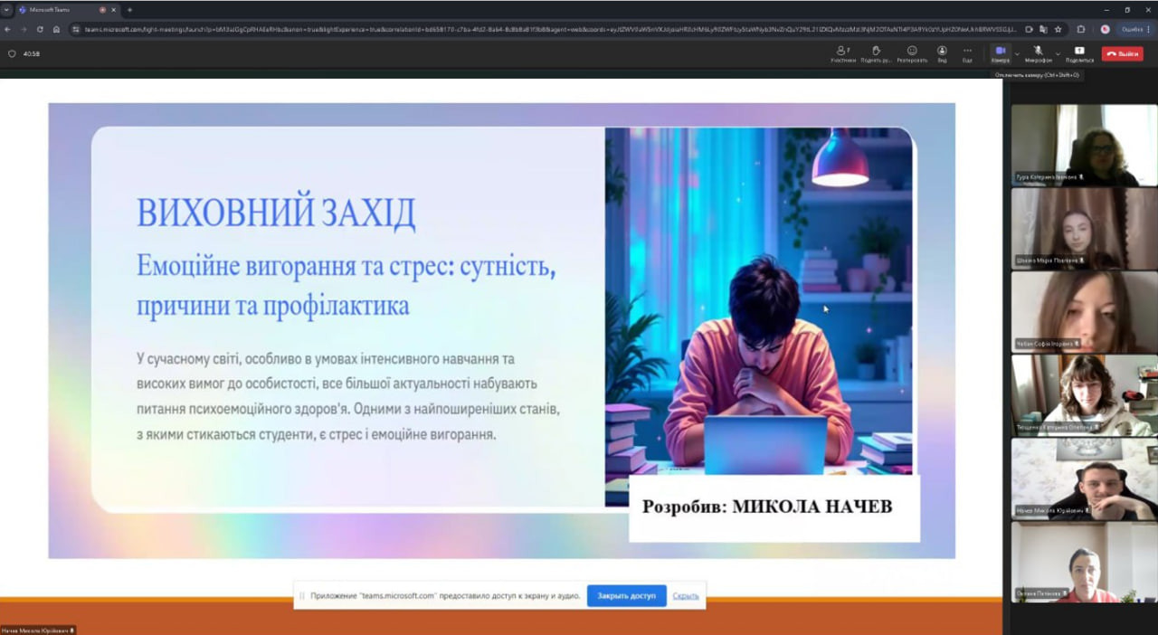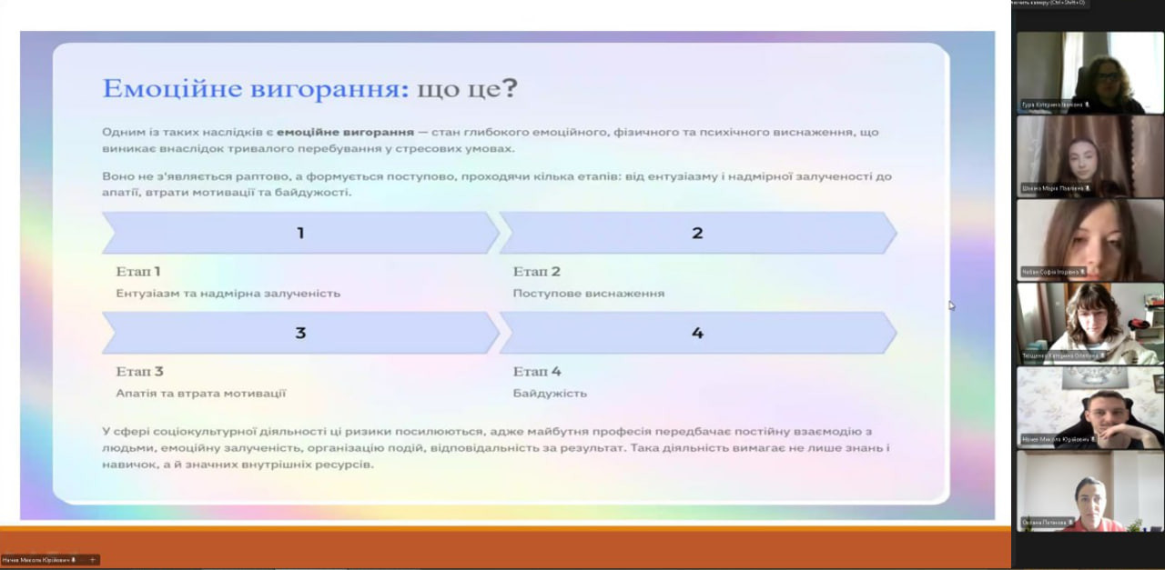 У межах проходження науково-педагогічної практики аспірантом ОНП «Філософія» Миколою Начевим зі студентами 1 курсу ОПП «Менеджмент соціокультурної діяльності», членами гуртка «Південноукраїнські наукові студії» було проведено виховний захід на тему «Емоційне вигорання та стрес: сутність, причини та профілактика». Захід поєднав теоретичний і практичний компоненти, що забезпечило його цілісність, змістовність та високий рівень залученості студентів. Перша частина – теоретична – була спрямована на розкриття природи стресу як адаптаційного механізму та осмислення емоційного вигорання. Проаналізовано етапи формування вигорання, його прояви та ризики в професії менеджера соціокультурної діяльності. З метою активізації навчальної взаємодії використані інтерактивні методи: міні-дискусії, робота в малих групах, аналіз кейсів, мозковий штурм щодо стратегій профілактики, а також рефлексивні вправи на усвідомлення власного емоційного стану та ресурсів. Це сприяло розвитку критичного мислення, емпатії та навичок саморефлексії у студентів.