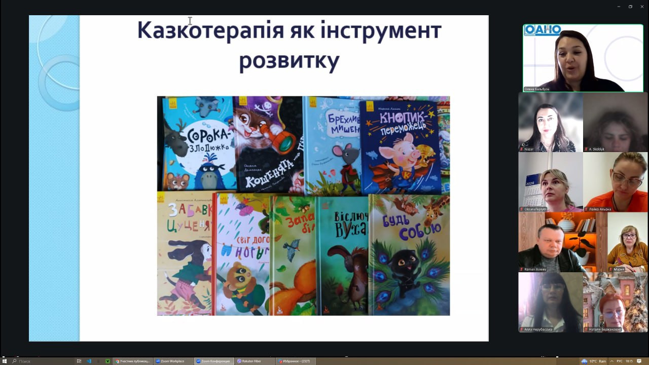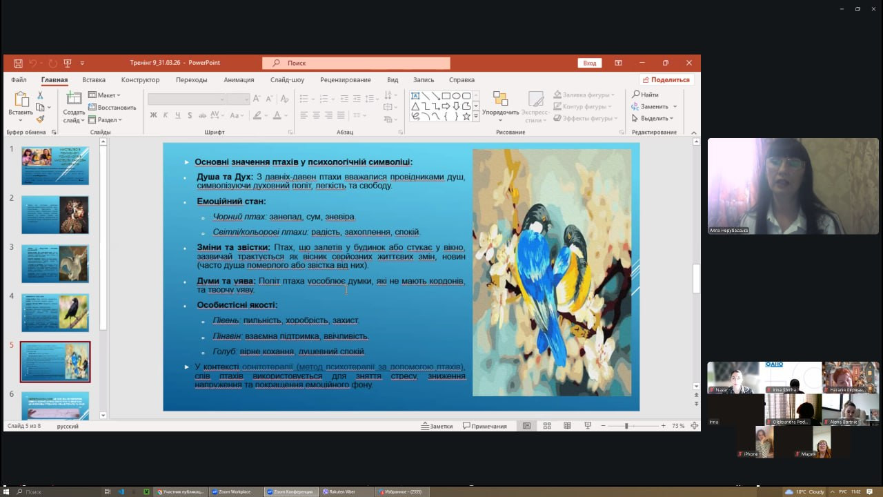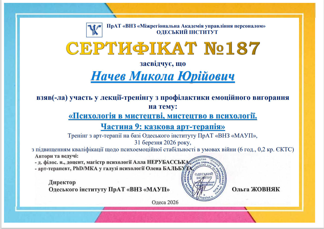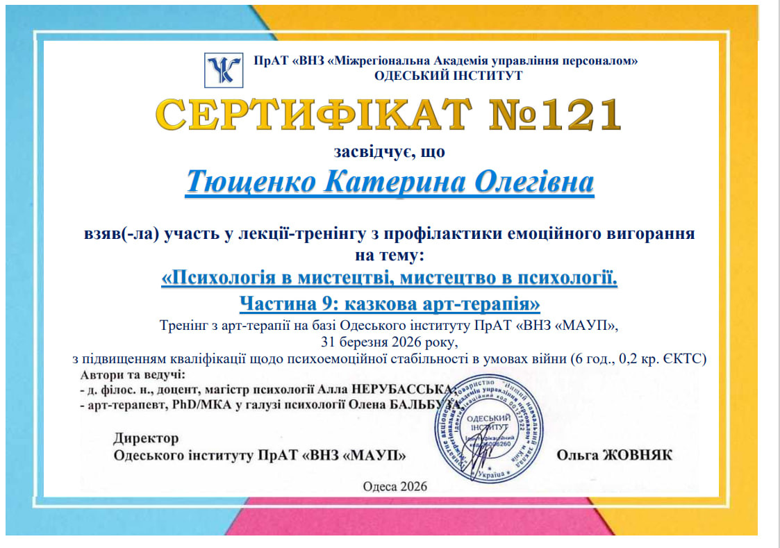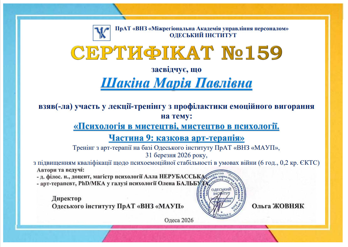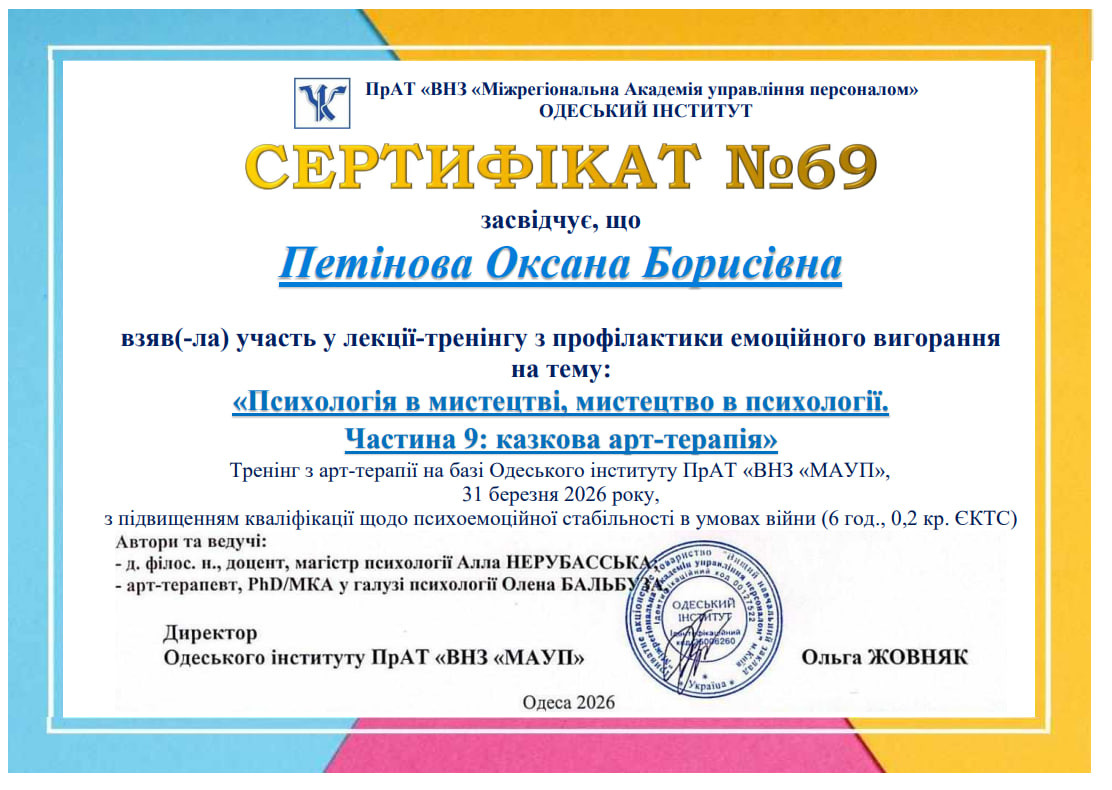 Друга частина – практична – передбачала участь у професійному тренінгу Одеського інституту ПрАТ «ВНЗ «МАУП» на тему: «Психологія в мистецтві, мистецтво в психології. Частина 9: казкова арт-терапія». Всі учасники заходу разом із Гарантом ОНП проф. Петіновою О. Б. долучилися до майстер-класу з казкотерапії та нейрографічного малювання, що сприяло емоційному розвантаженню, відновленню внутрішніх ресурсів і формуванню навичок саморегуляції.