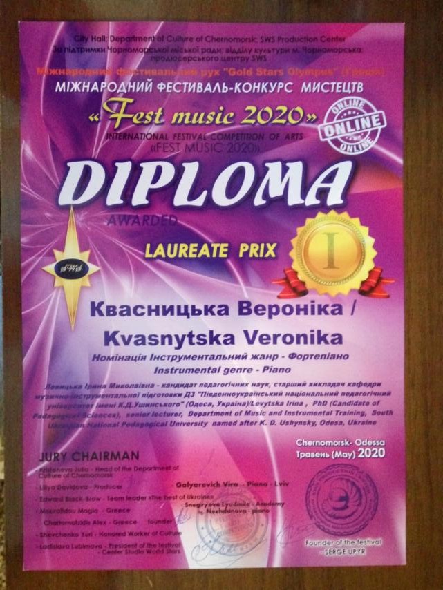Студенти факультету музичної та хореографічної освіти посіли призові міста в номінації "Інструментальний жанр (фортепіано)" на Міжнародному фестивалі-конкурсі мистецтв "FEST MUSIC 2020" (м.Чорноморськ). Володарем Гран-прі стала Войцуцька Катерина (клас ст.. викл. Мамикіної А.І.), звання лауреата І ступеню одержала Квасницька Вероніка (клас доц.. Левицької І.М.)