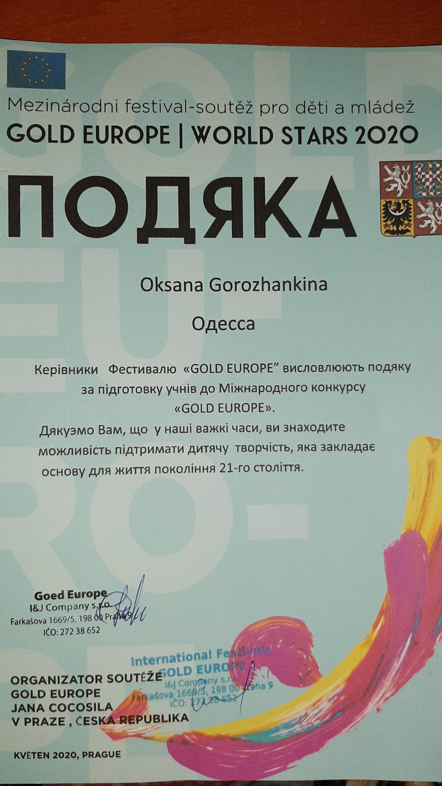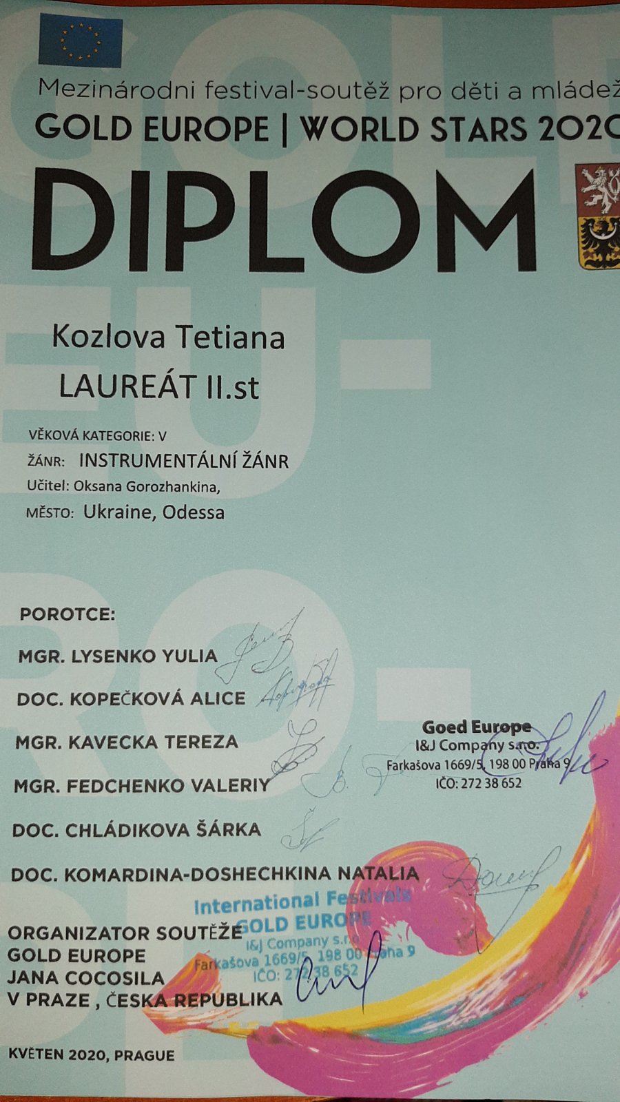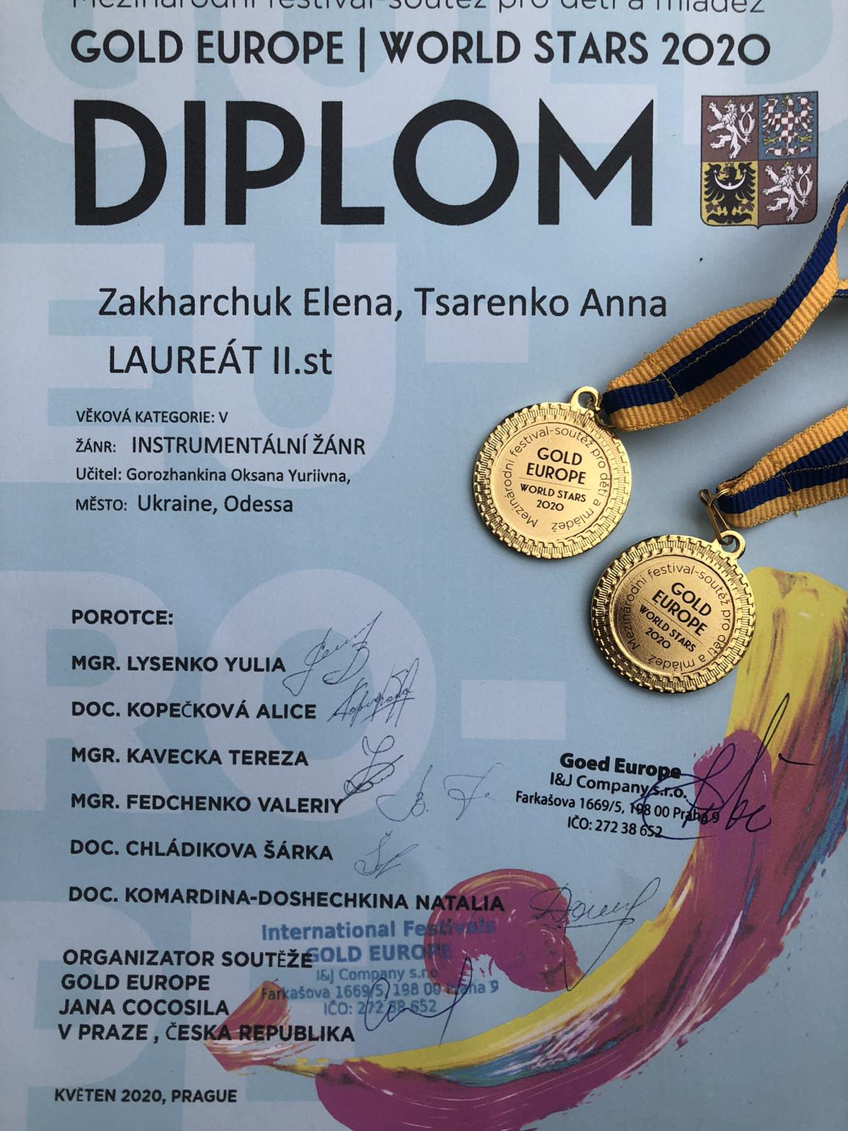 4-5 травня в м. Прага (Чехія) пройшов Міжнародний фестиваль-конкурс мистецтв «GOLD EUROPE Word Stars PRAGUE 2020», який зібрав понад 500 учасників з усього світу, серед яких були і студенти факультету музичної та хореографічної освіти. В номінації «Інструментальне мистецтво» лауреатами ІІ ступеню стали Козлова Тетяна, Захарчук Олена та Царенко Ганна (клас доцента Горожанкіної О.Ю.).