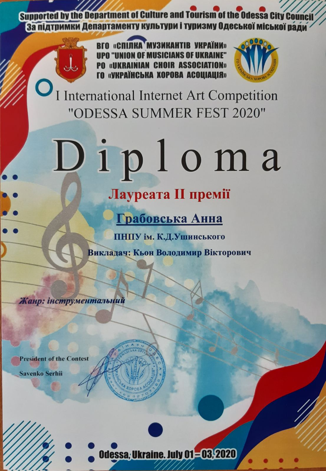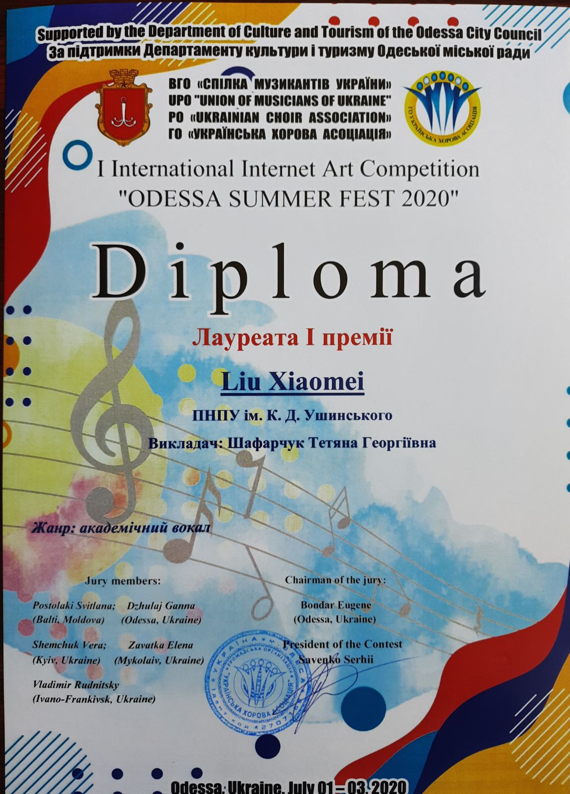 Вітаємо студентів факультету музичної та хореографічної освіти з успішним виступом на І Міжнародному фестивалі мистецтв «Summer Fest Odessa 2020», який проходив з 1 по 3 липня. В номінації «Академічний вокал» лауреатами І премії стала Маргарита Безчастна (клас доц.. Джулай Г.А.) та Лю Сяомей (клас ст. викл. Шафарчук Т.Г.). ІІ місце посіла Нателла Кебуладзе (клас ст. викл. Шафарчук Т.Г.). В номінації «Інструментальний жанр» звання лауреата ІІ премії одержав Юрій Данільченко (клас ст.викл. Десятнікової Н.Л.).