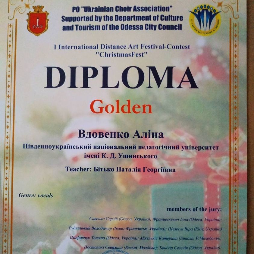 Сердечно вітаємо студентів і викладачів кафедри теорії музики і вокалу: Вдовенко Аліну (викл. Бітько Н. Г.) із званням Лауреата І ступеню двох конкурсів - International Art Festival Contest «Christmas Fest» та VI Дистанційного Міжнародного фестивалю-конкурсу «Samocvitty-On lanе» та Кебуладзе Нателлу (викл. Шафарчук Т. Г.), яка стала Лауреатом ІІ премії на Міжнародному конкурсі «Golden Talents of Madrid 2021».