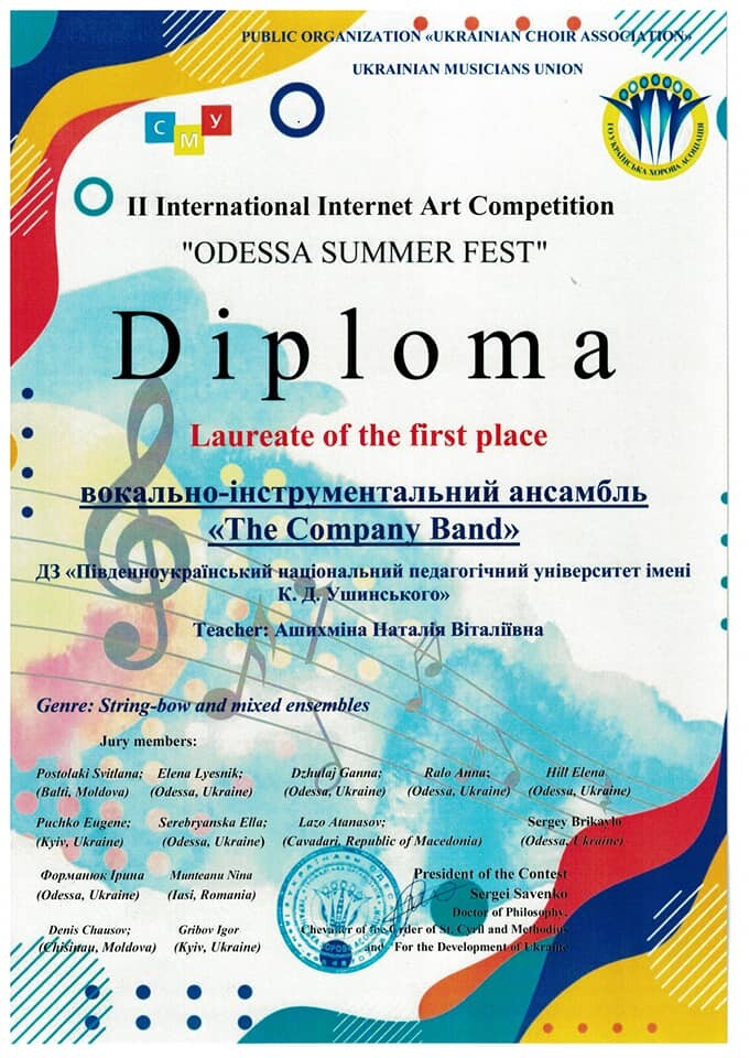 Творчі, креативні, розумні, відповідальні, цілеспрямовані… І це не весь перелік професійних якостей здобувачів факультету музичної та хореографічної освіти, які формуються на заняттях з фахових виконавських дисциплін. За рішенням журі звання лауреатів І ступеня отримали вокально-інструментальний ансамбль «The Company Band» (керівник -доц. Ашихміної Н.В.) Наталія Віталіївна) та інструментальне тріо у складі: Будаєвої Анастасії, Черноморець Марії, Царенко Ганни (доценти Ашихміна Н.В. і Клюєва С. Д.), які продемонстрували яскраві результати.