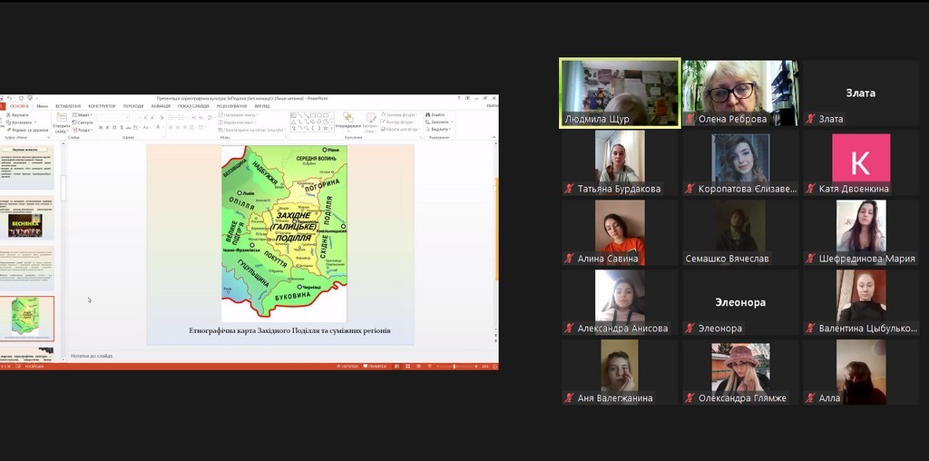02 лютого 2022 року на кафедрі музичного мистецтва і хореографії відбулася зустріч здобувачів і викладачів з кандидатом мистецтвознавства, викладачем кафедри музикознавства та методики музичного мистецтва Тернопільського національного педагогічного університету імені Володимира Гнатюка, Щур Людмилою Богданівною. Науковець дуже цікаво розповіла присутнім про результати дослідження щодо витоків та здобутків народної хореографії Західного Поділля. Цей пласт народної творчості був мало досліджений науковцями. Було здійснено чимало фольклорних експедицій, записів народних традицій із застосуванням танцювально-музичної творчості мешканців багатьох селищ Тернопільщини. Екскурс в історію краю виявився доречним, коли дослідниця презентувала втілену в народну лексику ментальність різних етносів, що створили цікавий фольклорний продукт − народну хореографію Західного Поділля.