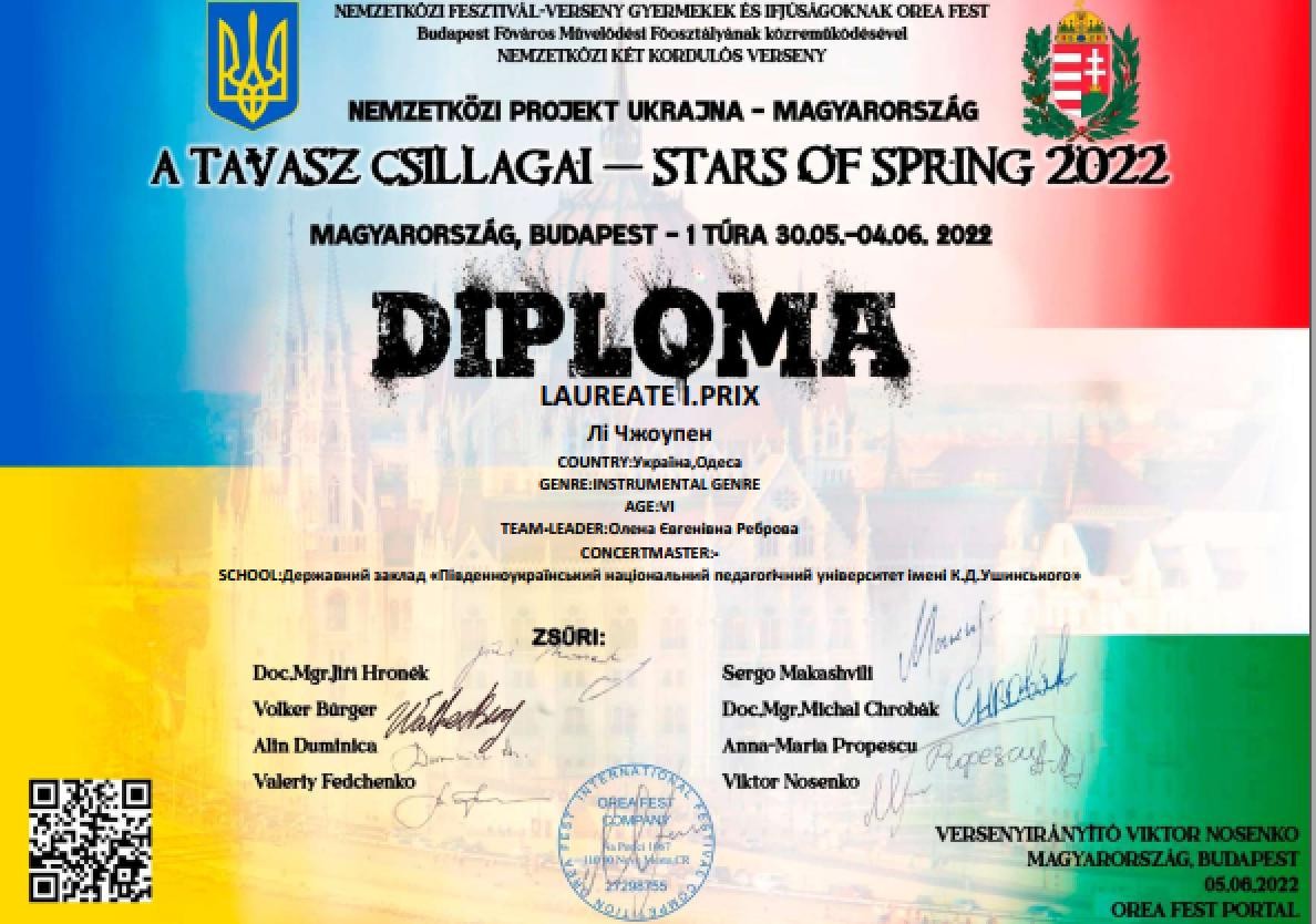 У конкурсному Україно-Угорському проєкті «STARS JF SPRING 2022», що проводився на базі Міжнародного фестивального порталу OREA FEST з 30.05.2022 по 04.06.2022, взяли участь наші студенти. У різних номінаціях вони отримали дипломи лауреатів 1 ступеню.