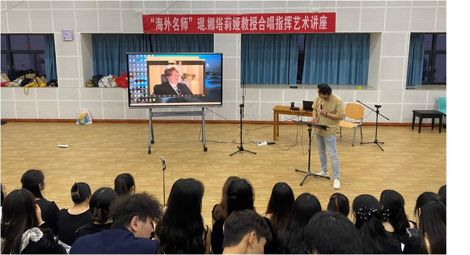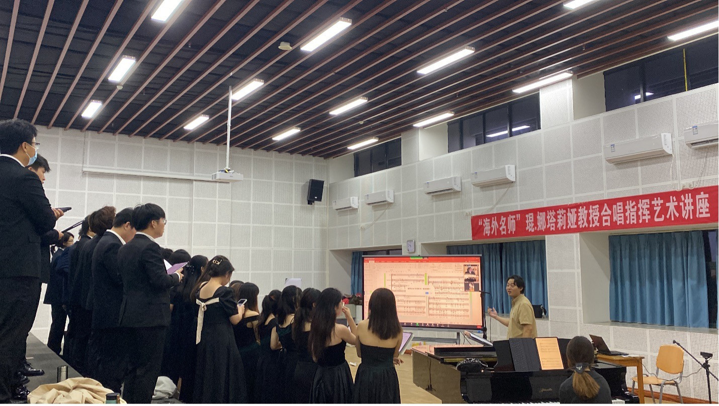 Професор кафедри теорії музики і вокалу Наталя Кьон продемонструвала цикл відеопрезентацій з історії українського хорового мистецтва та інноваційних методів роботи в галузі вокально-хорового мистецтва, а також провела майстерклас із вивчення українського репертуару з хором студентів 1-3 курсів за участю Ма Сюй як диригента хорового колективу.