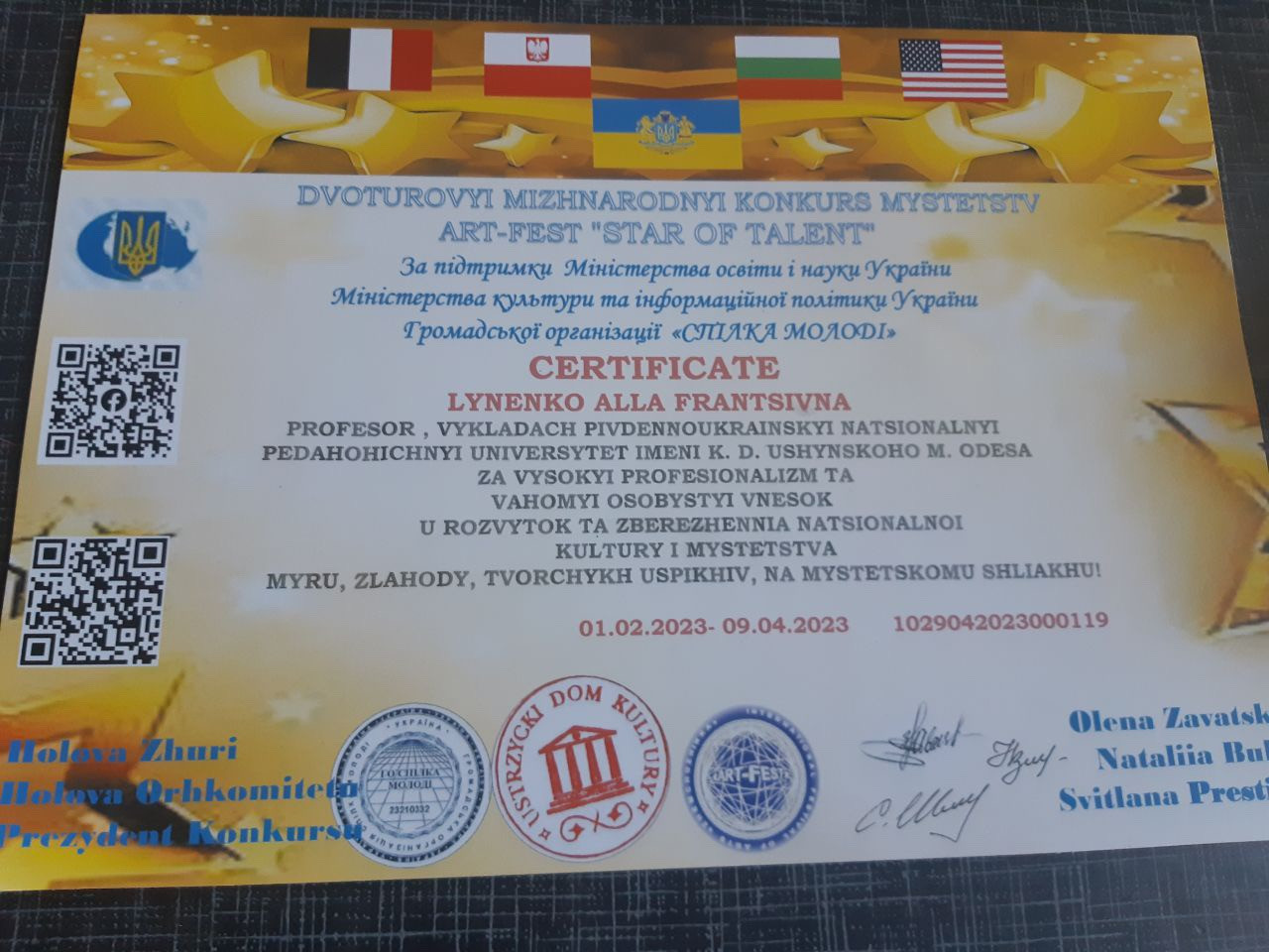 Вітаємо студента факультету музичної та хореографічної освіти Чжан Юйцзя з отриманням почесної нагороди – Гран-прі Міжнародного конкурсу мистецтв ART-FEST «STAR OF TALENT» UKRAINA-POLSHCHA-BOLHARIIA-FRANTSIIA-AMERYKA. Міжнародний конкурс мистецтв ART-FEST «STAR OF TALENT» проходив за підтримки Міністерства культури та інформаційної політики України та Міністерства освіти і науки України з метою виявлення найбільш обдарованих виконавців, популяризації української, європейської і світової класики, обміну досвідом з питань педагогіки та виконавської майстерності.