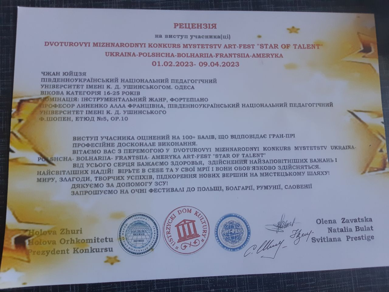 Вітаємо студента факультету музичної та хореографічної освіти Чжан Юйцзя з отриманням почесної нагороди – Гран-прі Міжнародного конкурсу мистецтв ART-FEST «STAR OF TALENT» UKRAINA-POLSHCHA-BOLHARIIA-FRANTSIIA-AMERYKA.