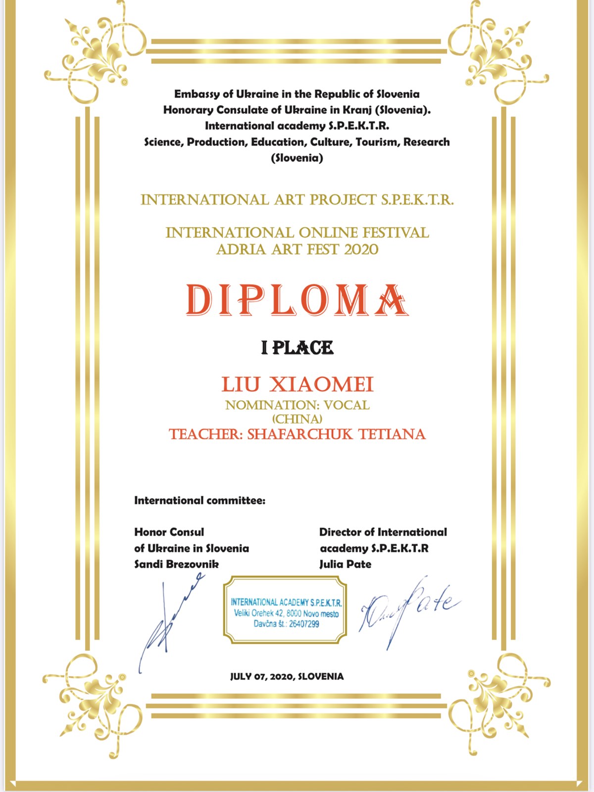 Міжнародний фестиваль «Adria art fest 2020», який відбувся під патронатом Посольства України в Республіці Словенія, Почесного консула України в Словенії Санді Брезовніка та Міністерства культури України пройшов в м. Любляна (Словенія) 7 липня 2020 року. Лауреатом І ступеню в номінації «Академічний спів» стала студентка факультету музичної та хореографічної освіти Лю Сяомей (клас викл. Шафарчук Т.Г.).