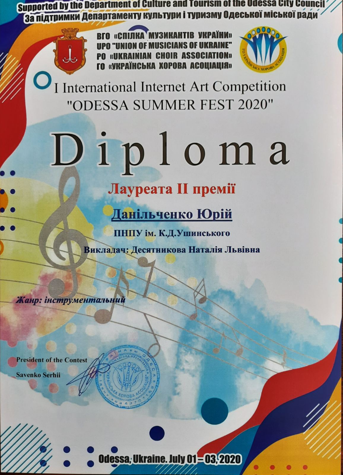 Вітаємо студентів факультету музичної та хореографічної освіти з успішним виступом на І Міжнародному фестивалі мистецтв «Summer Fest Odessa 2020», який проходив з 1 по 3 липня. В номінації «Академічний вокал» лауреатами І премії стала Маргарита Безчастна (клас доц.. Джулай Г.А.) та Лю Сяомей (клас ст. викл. Шафарчук Т.Г.). ІІ місце посіла Нателла Кебуладзе (клас ст. викл. Шафарчук Т.Г.). В номінації «Інструментальний жанр» звання лауреата ІІ премії одержав Юрій Данільченко (клас ст.викл. Десятнікової Н.Л.).