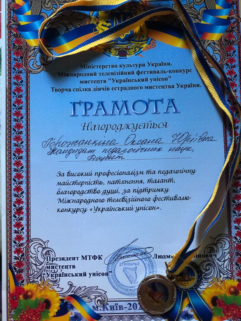 З 4 по 7 липня в 2020 року в м. Київ пройшов Міжнародний телевізійний фестиваль-конкурс мистецтв «Український унісон», який проводиться в рамках Міжнародного культурно-мистецького проекту «Україна іде по Землі» за підтримки Міністерства культури України, Національної радіокомпанії «Українське радіо», телеканала «Культура».