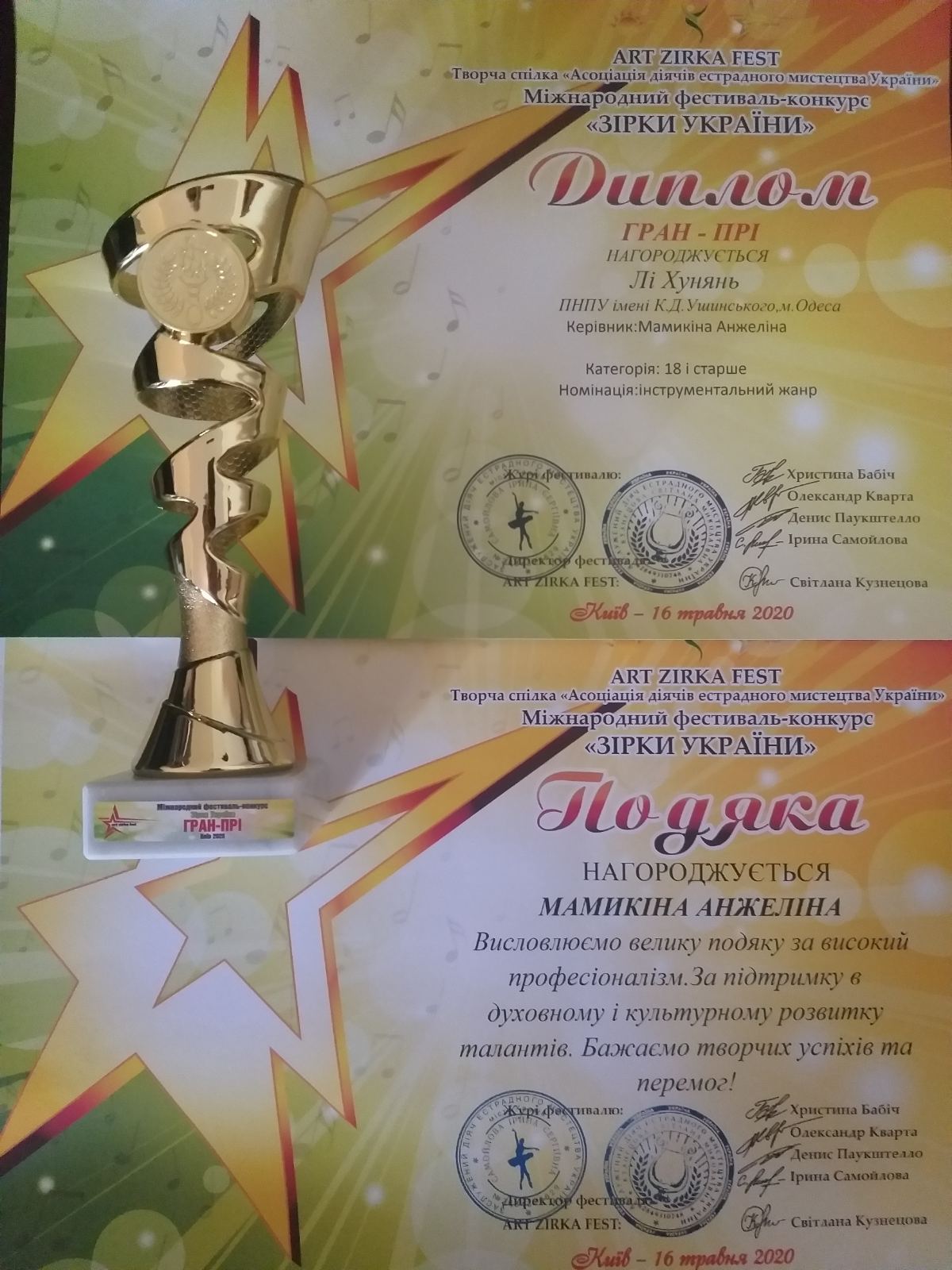 Студентка магістратури факультету музичної та хореографічної освіти Лі Хунянь (клас ст. викл. Мамикіної А.І.) стала володарем Гран-прі Міжнародного фестивалю-конкурсу "Зірки України", який пройшов 16 травня 2020 року в м. Київ.
