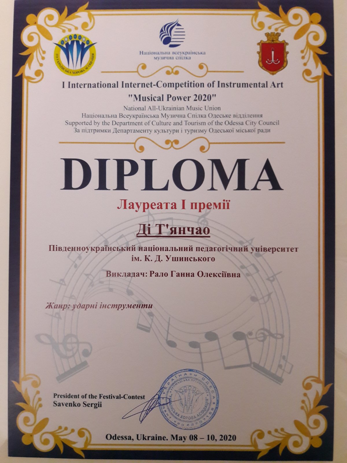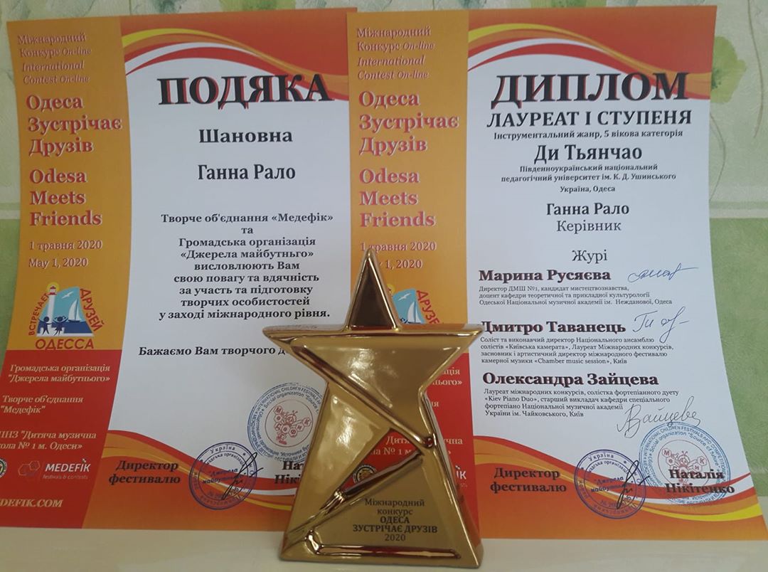 Справжній одеський Міжнародний конкурс мистецтв "Одеса зустрічає друзів" кожного року збирає різні творчі колективи і солістів з різних країн світу. 1 травня 2020 року конкурс пройшов в дистанційному форматі. За результатами цього конкурсу магістрант факультету музичної та хореографічної освіти класу ударних інструментів Ді Т'янчао був нагороджений 1 премією.