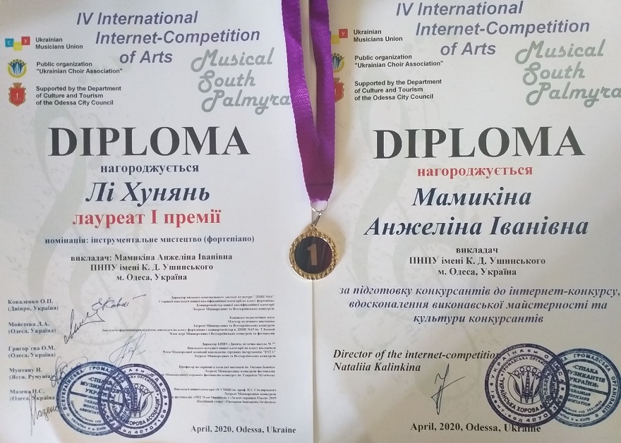 В IV Міжнародному інтернет-конкурсу мистецтв " Musical South Palmira" (м. Одеса) здобувачка другого ( магістерського) рівня Лі Хунянь (клас викл. Мамикіної А.І.) одержала І премію в номінації «Інструментальне мистецтво».