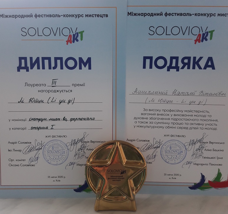 Вітаємо студентку 3 курсу факультету музичної та хореографічної освіти Лі Юйци (клас старшого викладача кафедри диригентсько-хорової підготовки Ашихміної Н.В.), яка посіла звання Лауреата ІІІ премії у І Міжнародному фестивалі-конкурсі мистецтв "SOLOVIOV ART ", що пройшов 25 квітня 2020 року в м. Київ.